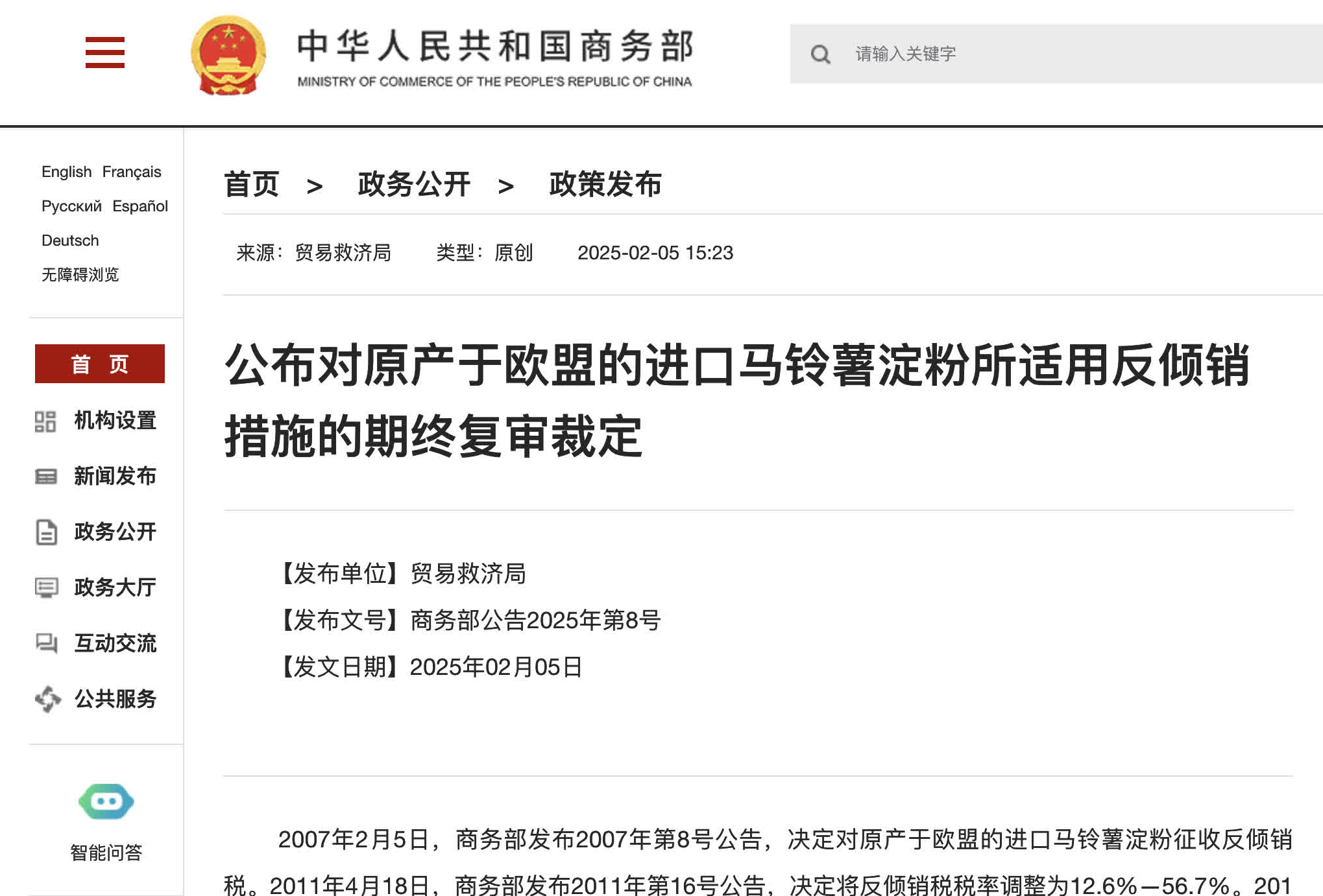 ●2007年2月5日,商務部發布2007年第8號公告,決定對原產於歐盟的進口馬鈴薯澱粉徵收反傾銷稅。