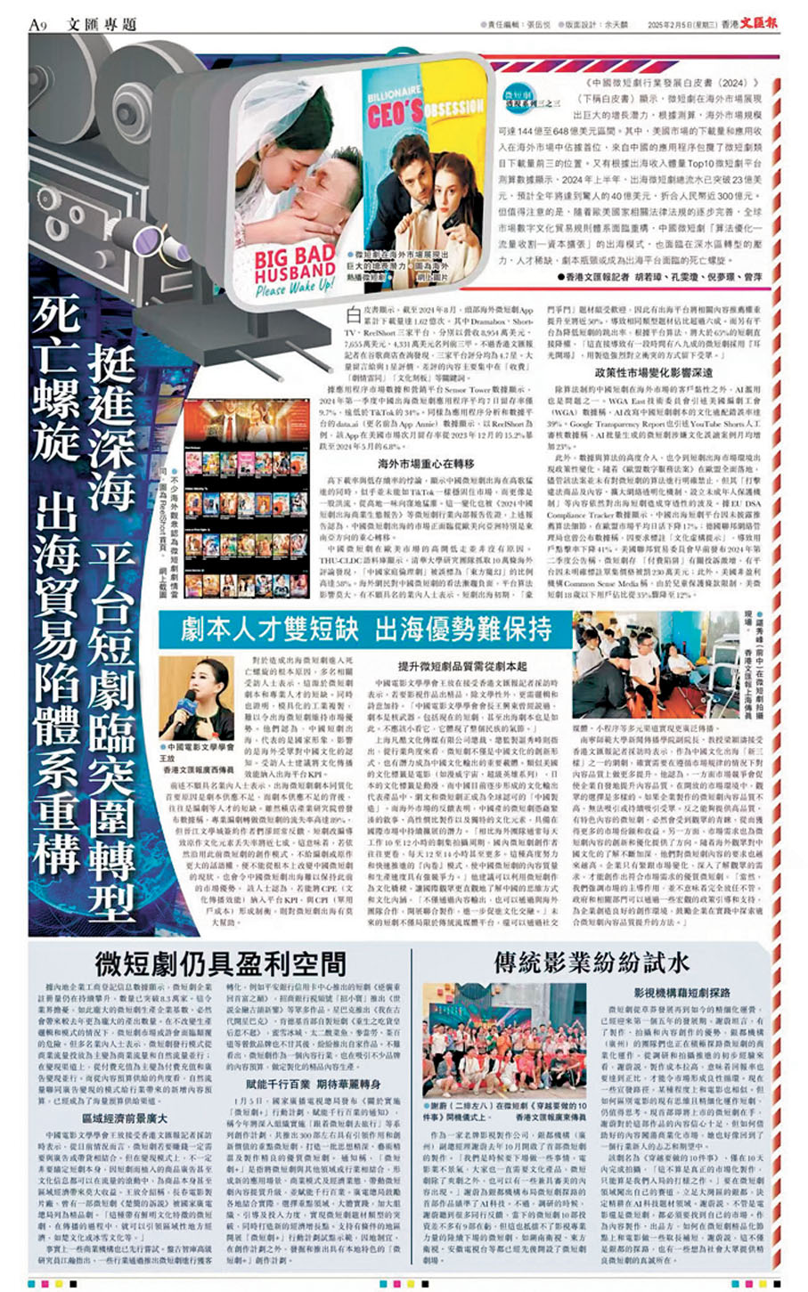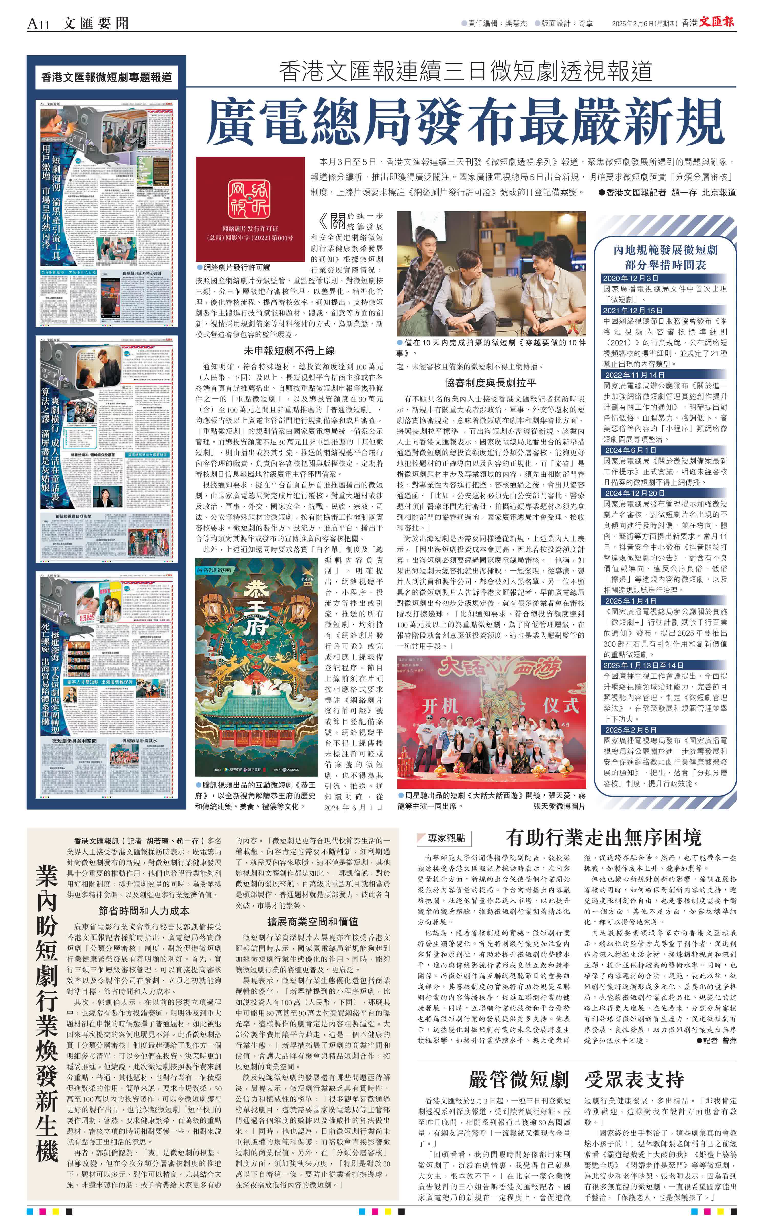 (香港文匯報記者 胡若璋、趙一存)多名業界人士接受香港文匯報採訪時表示,廣電總局針對微短劇發布的新規,對微短劇行業健康發展具十分重要的推動作用。他們也希望行業能夠利用好相關制度,提升短劇質量的同時,為受眾提供更多精神食糧,以及創造更多行業經濟價值。