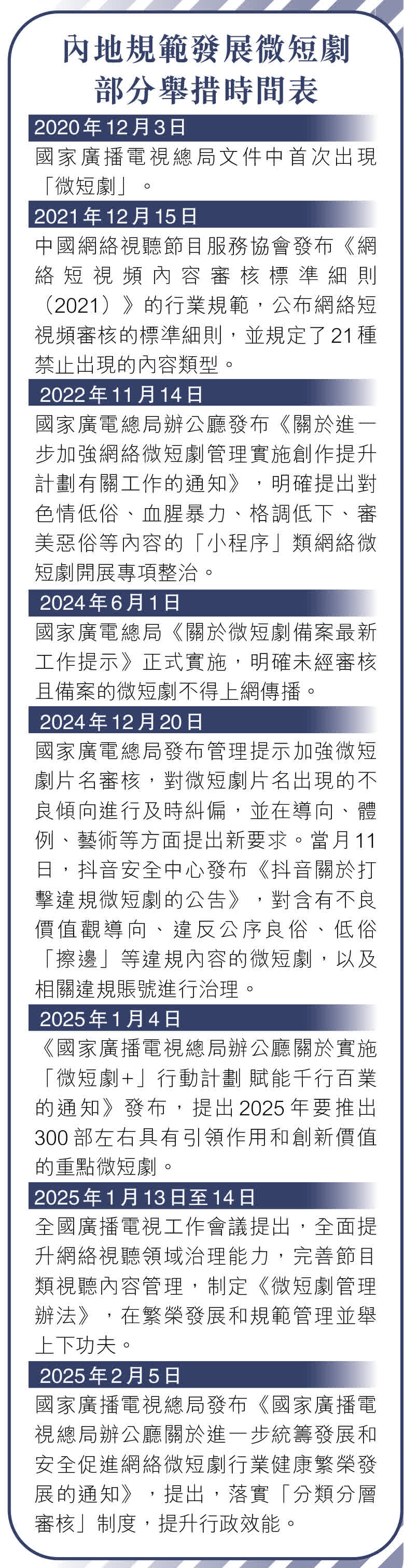 對於出海短劇是否需要同樣遵從新規,上述業內人士表示,「因出海短劇投資成本會更高,因此若按投資額度計算,出海短劇必須要經過國家廣電總局審核。」他稱,如果出海短劇未經審批就出海播映,一經發現,從導演、製片人到演員和製作公司,都會被列入黑名單。另一位不願具名的微短劇製片人告訴香港文匯報記者,早前廣電總局對微短劇出台初步分級規定後,就有很多從業者會在審核階段打擦邊球,「比如通知要求,符合總投資額度達到100萬元及以上的為重點微短劇,為了降低管理層級,在報審階段就會刻意壓低投資額度。這也是業內應對監管的一種常用手段。」
