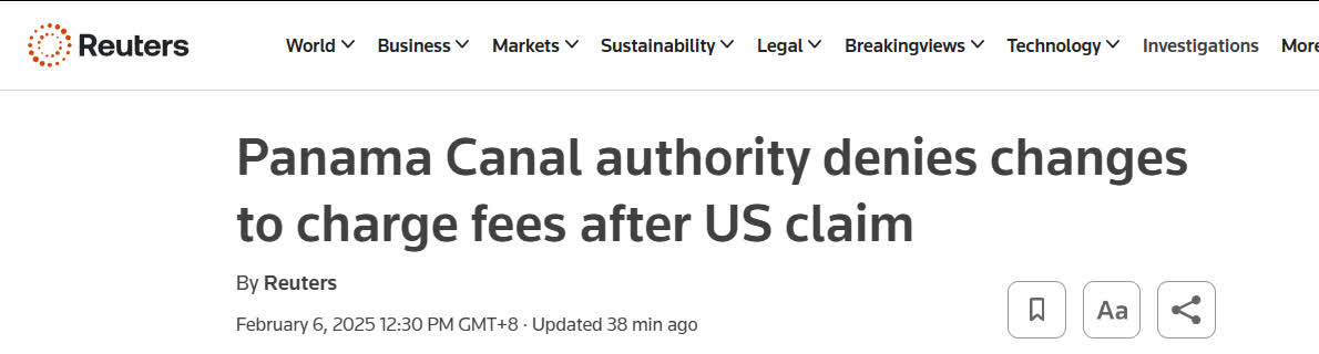 據央視新聞報道,當地時間2月5日晚間,巴拿馬運河管理局就美國政府當天稍早時的一份聲明發表回應聲明。巴拿馬運河管理局在聲明中否認了美國國務院當日早些時候所說的「美國政府船隻現在可免費通過巴拿馬運河」的內容,表示相關資費沒有任何調整。