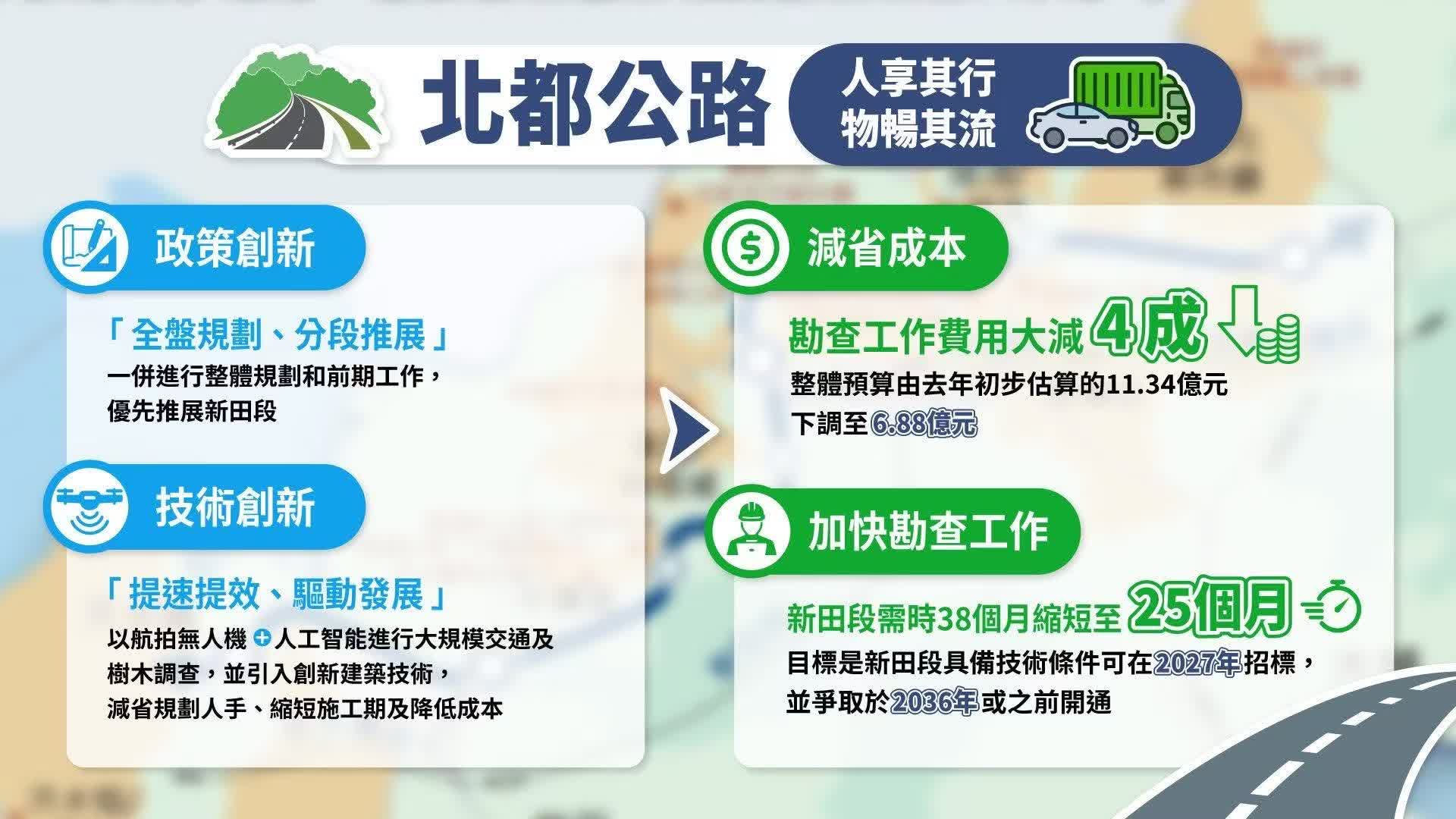 路政署表示,將採取「政策」及「技術」雙創新思維,積極壓縮勘查工作的預算費用及時間表。整體預算較去年初步估算減幅接近四成,而新田段的勘查工作預計提早約一年完成。