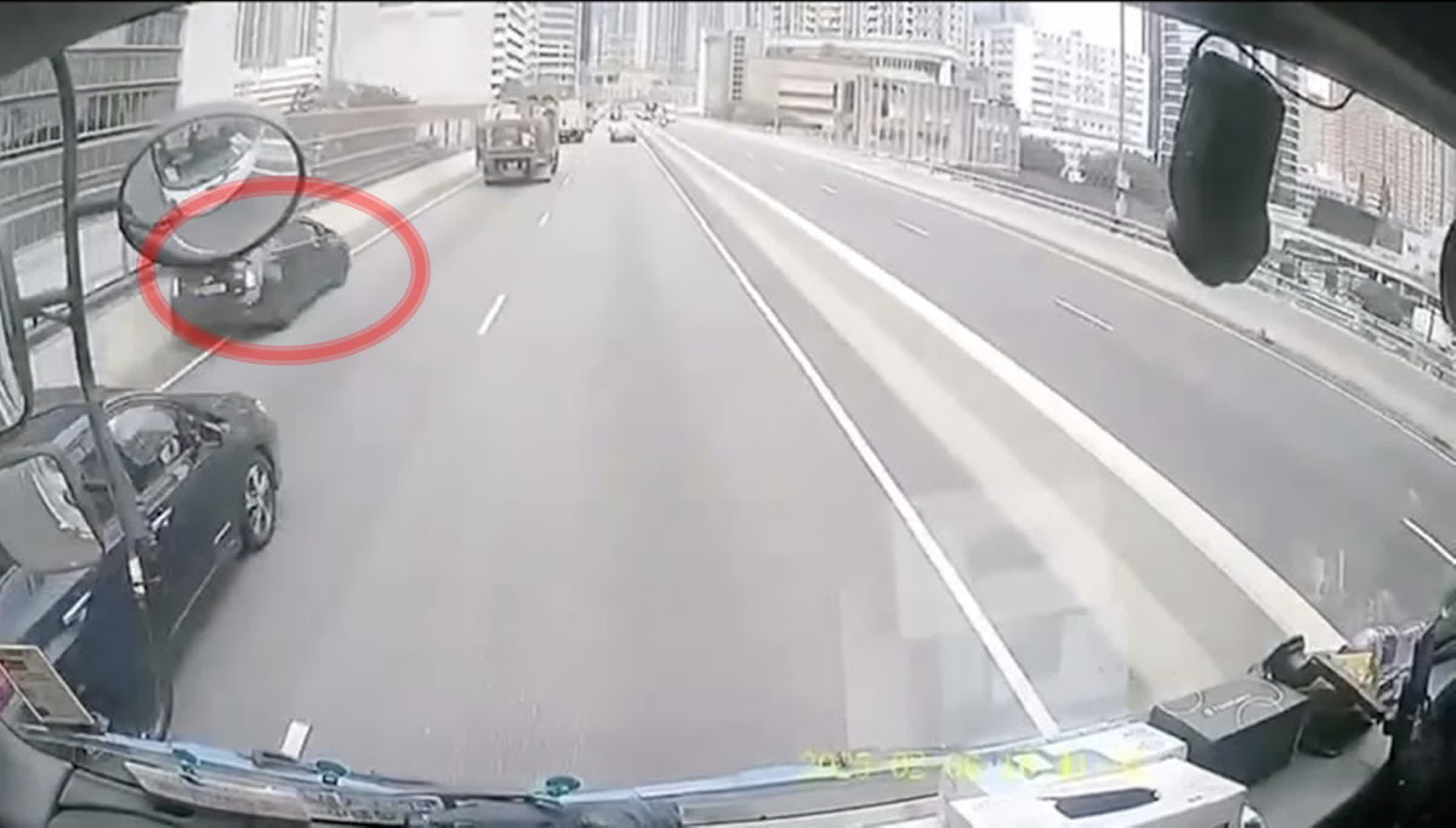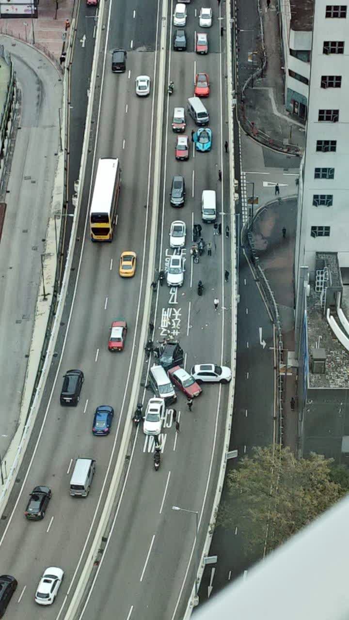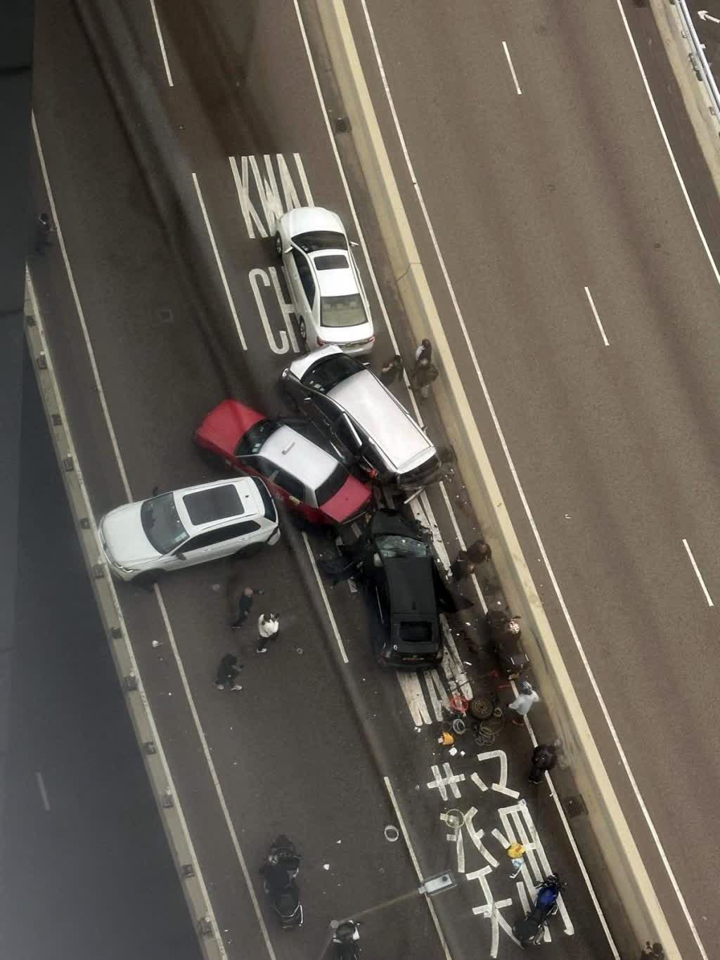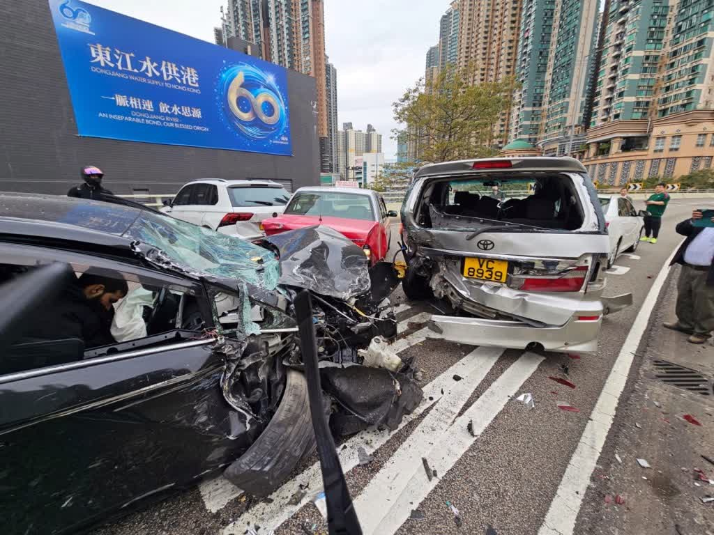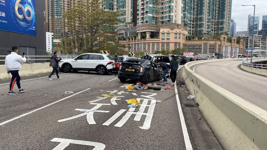 由網上片段可見,事時非常多車,突有一輛黑色私家車從慢線左邊的路肩高速飛馳,約5至6秒後便發生意外。意外中4輛私家車和1輛的士「炒埋一碟」,停在兩條行車線上,地上遺下大量雜物和碎片,並有一個車輪,其中一輛黑色私家車車頭嚴重毀爛,擋風玻璃爆裂,安全氣袋彈出,南亞裔男司機頸部受傷被困,清醒,有其他駕駛人士上前查看情況。