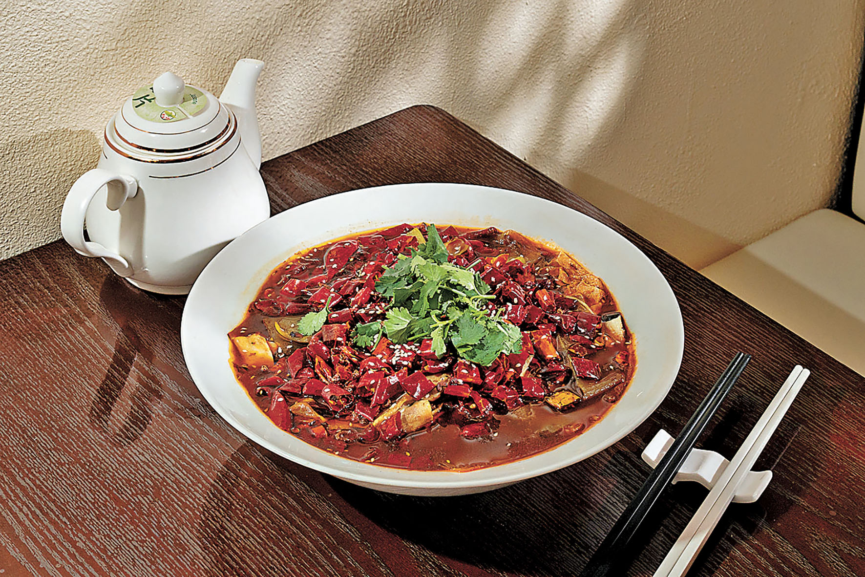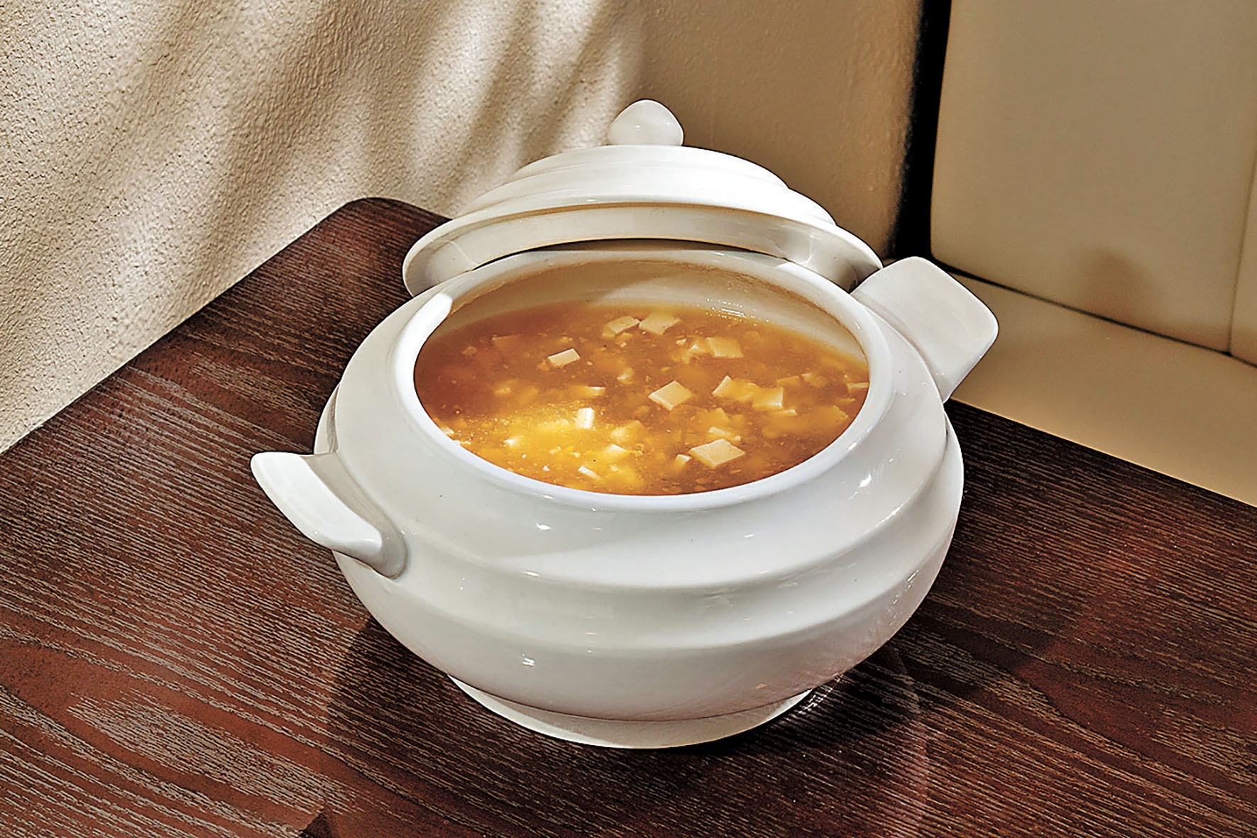 大廚精心挑選各種菇菌作為食材,將本是肉類的菜式轉變為一道道素食佳品。例如,香菇燒賣(42元)、素翅灌湯小籠包(48元)、筍尖蝦餃皇(42元)等,既傳統又創新,令人垂涎。如果想享受更奢華的美味,還可以選擇黑松露野菌餃(46元),讓松露的濃郁香氣隨着蒸氣四溢,溫暖人心。除了素食點心,緻素坊亦會供應各種粵菜及川菜美饌。包括全新推出的如意鮮黃耳扒(168元),鮮嫩黃耳搭配自家調配的醇厚醬汁,令人回味無窮;招牌的秘製叉燒(138元)以小麥麵筋製成,經自家製素食叉燒醬醃製後,再以多種茶葉煙熏,打造焦香的風味;四川秘製水煮魚(258元),先以薄片杏鮑菇重現魚肉的質感,並與四種菇菌、四川進口香料和辣椒燉煮,締造出香辣濃郁的湯底。秘製鎮江骨(138元)更是一道特別的菜式,外皮薄薄的鎮江醬,內裏是豆腐乾和蓮藕條,超惹味,有煥然一新的感覺。而粟米豆腐羹(例138元)則用料豐富。