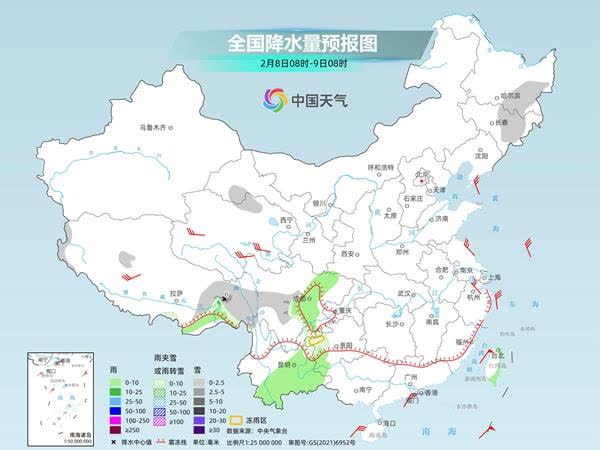 今明兩天(2月7日至8日),寒潮繼續影響我國,中東部氣溫將陸續迎來這輪過程的最低點,並將大面積創今冬以來氣溫新低。同時,全國降水範圍有所縮減,主要出現在東北地區、西南地區東部、華南西部等地,強度不大,以小到中雨雪為主,眼下仍是出行出遊高峰期,公眾需注意防範低溫、大風、降水天氣帶來的不利影響。