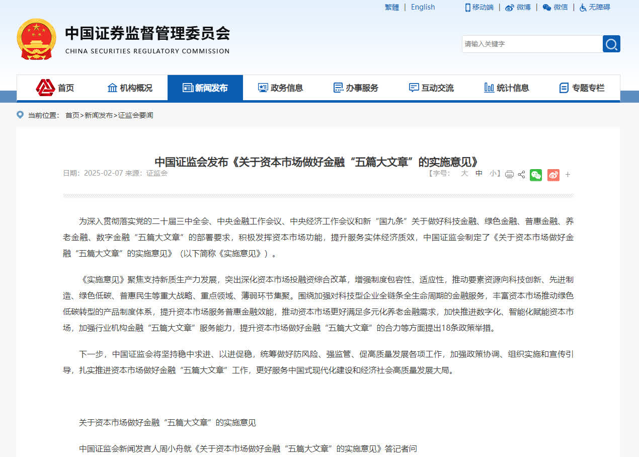 (香港文匯網記者李暢 北京報道)中國證監會7日發布《關於資本市場做好金融「五篇大文章」的實施意見》(以下簡稱《實施意見》)。《實施意見》強調,要加強對科技型企業全鏈條全生命周期的金融服務,並着力打通社保、保險等中長期資金入市卡點堵點,以「長錢長投」激發資本市場活力。