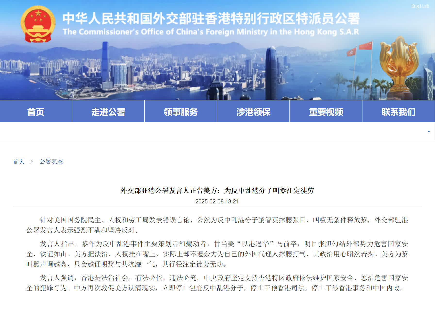針對美國國務院民主、人權和勞工局發表錯誤言論,公然為反中亂港分子黎智英撐腰張目,叫嚷無條件釋放黎,外交部駐港公署發言人表示強烈不滿和堅決反對。