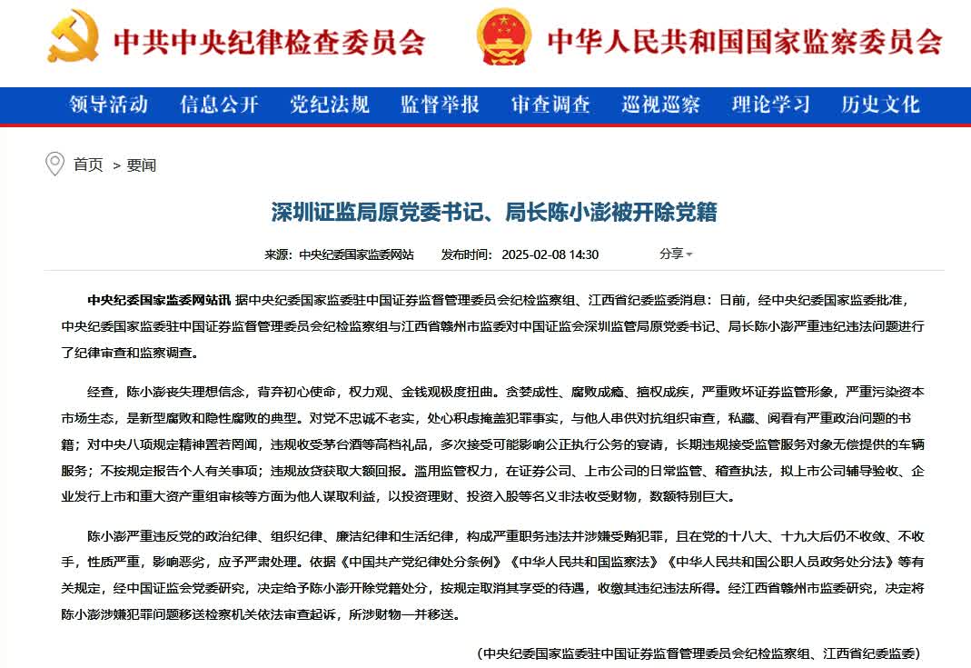 據中央紀委國家監委駐中國證券監督管理委員會紀檢監察組、江西省紀委監委消息:日前,經中央紀委國家監委批准,中央紀委國家監委駐中國證券監督管理委員會紀檢監察組與江西省贛州市監委對中國證監會深圳監管局原黨委書記、局長陳小澎嚴重違紀違法問題進行了紀律審查和監察調查。