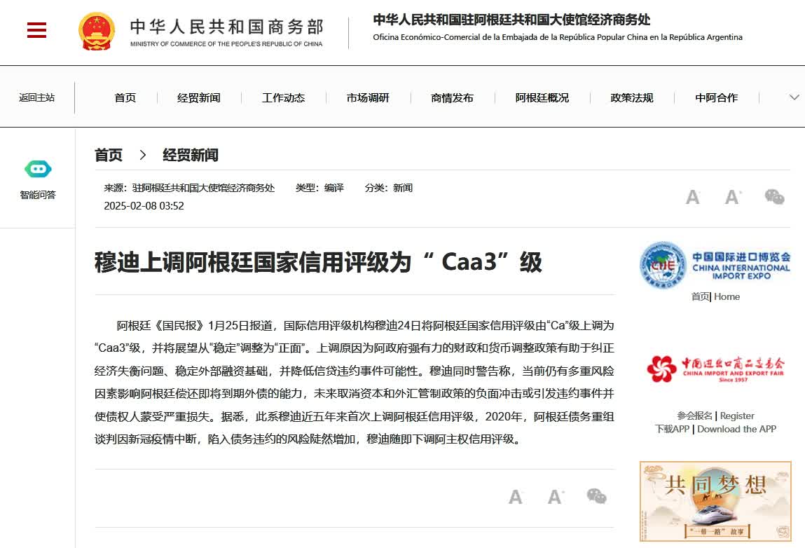 據中國駐阿根廷共和國大使館經濟商務處8日消息,阿根廷《國民報》1月25日報道,國際信用評級機構穆迪24日將阿根廷國家信用評級由「Ca」級上調為「Caa3」級,並將展望從「穩定」調整為「正面」。上調原因為阿政府強有力的財政和貨幣調整政策有助於糾正經濟失衡問題、穩定外部融資基礎,並降低信貸違約事件可能性。穆迪同時警告稱,當前仍有多重風險因素影響阿根廷償還即將到期外債的能力,未來取消資本和外匯管制政策的負面衝擊或引發違約事件並使債權人蒙受嚴重損失。據悉,此系穆迪近五年來首次上調阿根廷信用評級,2020年,阿根廷債務重組談判因新冠疫情中斷,陷入債務違約的風險陡然增加,穆迪隨即下調阿主權信用評級。