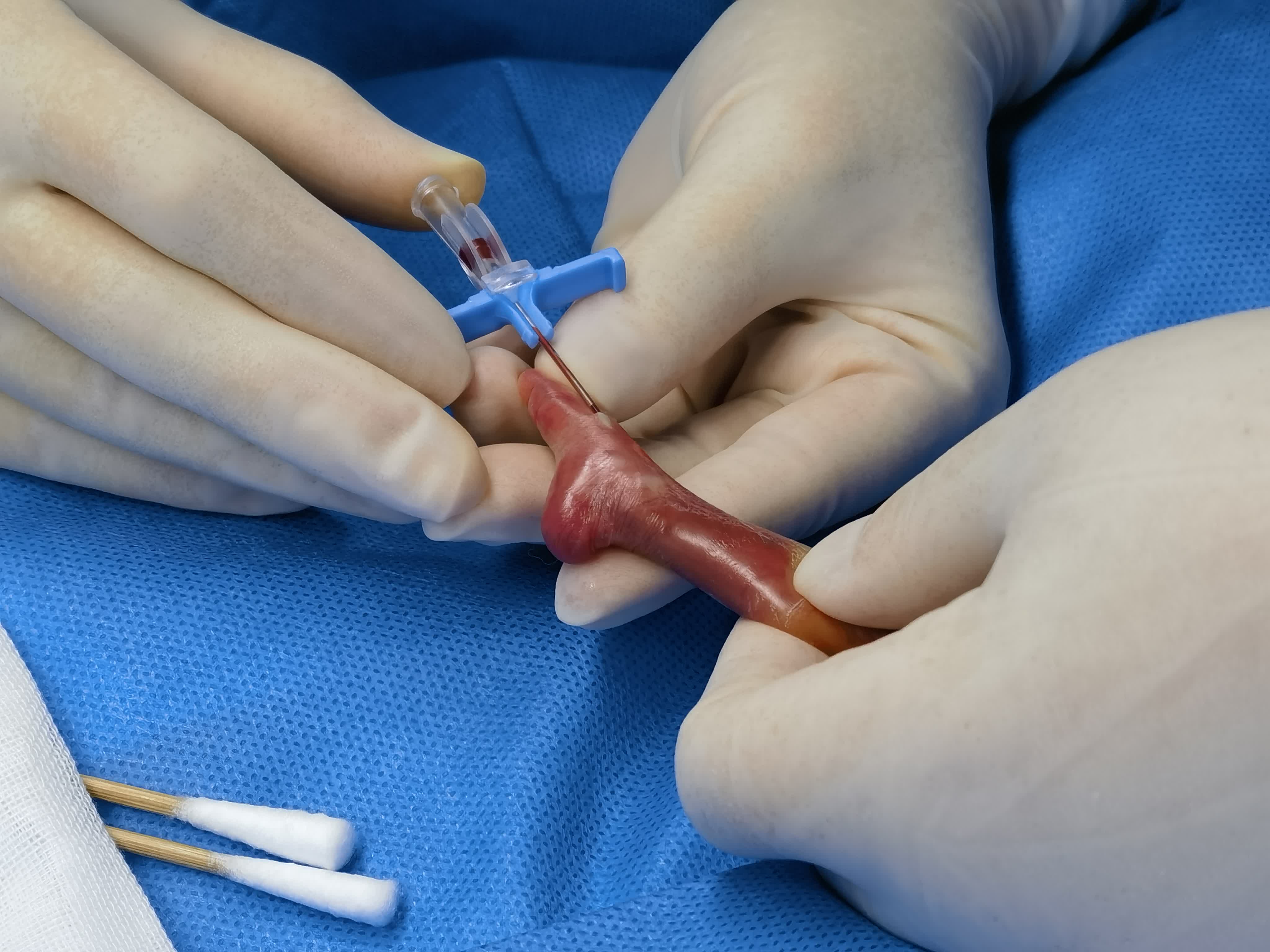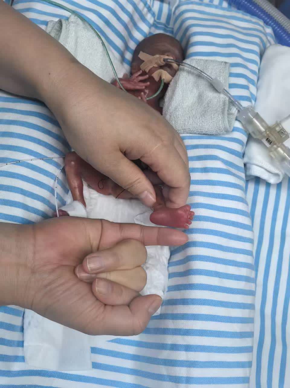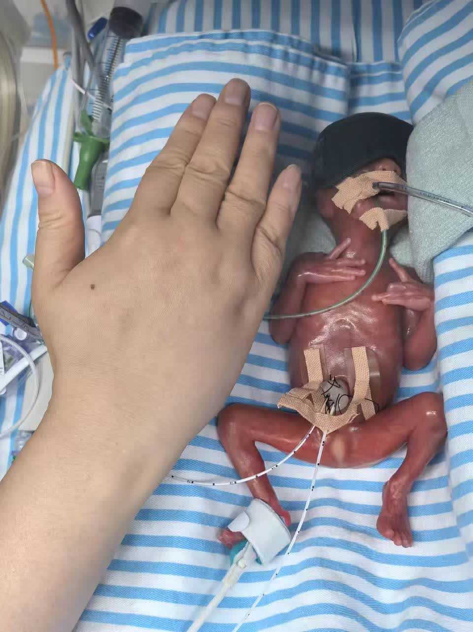 「哪怕希望再渺茫,我們也要為這個小生命鋪一條路。」醫院會診專家的意見讓瑞澤媽媽一家吃了一顆定心丸。9月23日,瑞澤出生了,體重360克,孕周22周3天,屬於生存極限早產兒(即小於24周以下出生的早產兒)。醫院立即啟動黃金1小時生死時速:暖箱早已提前預熱,出生1分鐘內醫生們成功為瑞澤建立了有效呼吸通道,護士用塑料薄膜包裹住他薄如蟬翼的皮膚。18分鐘內,瑞澤被安全轉運至NICU。40分鐘時,臍動脈、臍靜脈置管順利完成,藥物與營養液通過一條條「生命通道」緩緩注入他小小的身體,醫護們一步一步有條不紊的搭建着「生命的橋樑」。