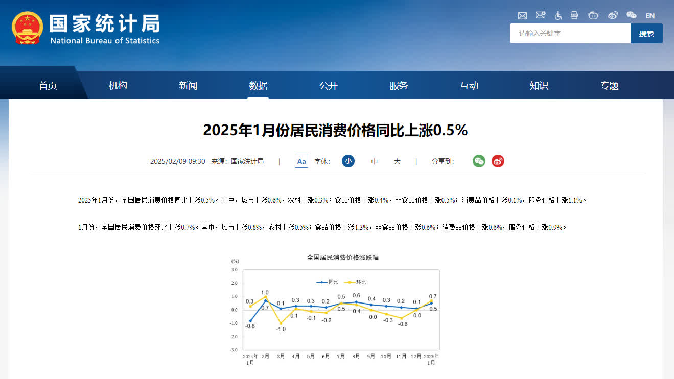 國家統計局9日發布數據顯示,1月份,受春節因素影響,全國居民消費價格指數(CPI)漲幅擴大,同比漲幅由上月的0.1%擴大至0.5%,環比由上月持平轉為上漲0.7%。