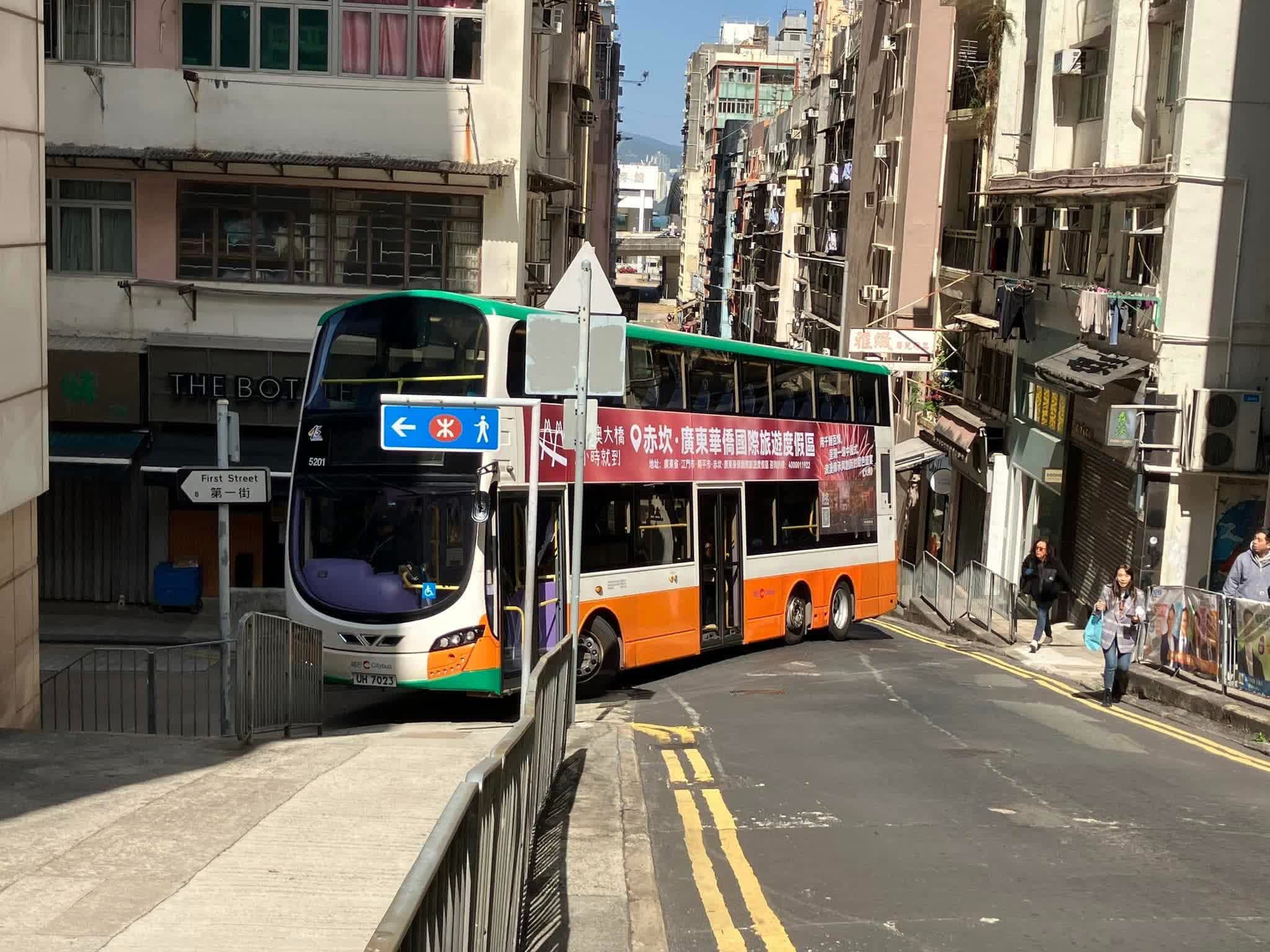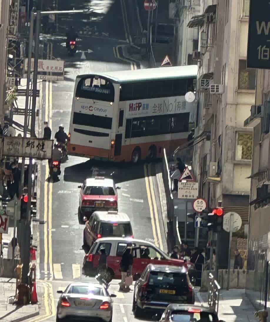 香港文匯報訊(記者 蕭景源)今日(9日)下午1時許,一輛970路線城巴在西營盤懷疑行錯路駛上東邊街轉入第一街時,因路面狹窄卡死路中,無法駛過轉角位,進退維谷。受事件影響,現場交通嚴重擠塞,警員到場協助封路。