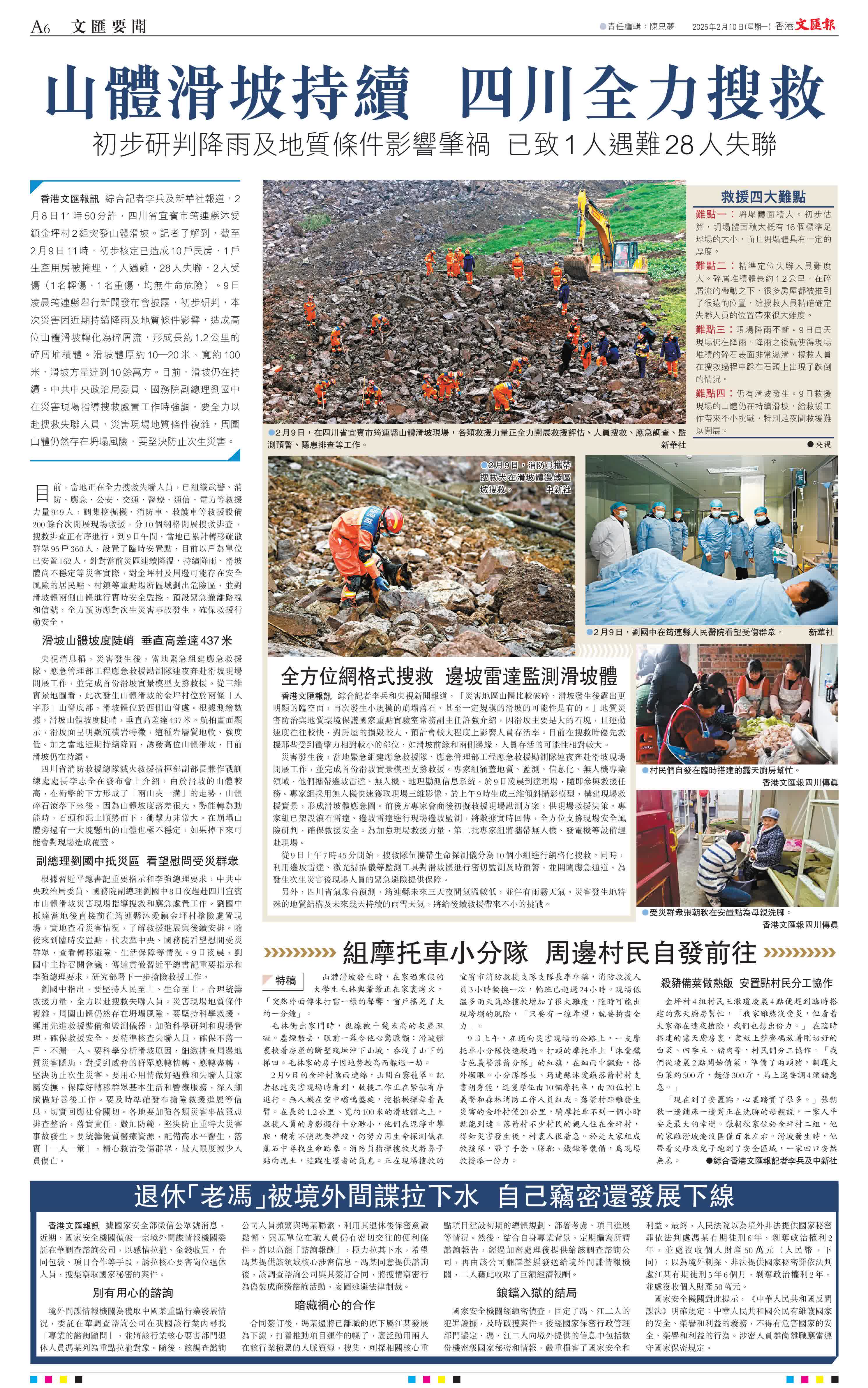 香港文匯報訊 綜合記者李兵及新華社報道,2月8日11時50分許,四川省宜賓市筠連縣沐愛鎮金坪村2組突發山體滑坡。記者了解到,截至2月9日11時,初步核定已造成10戶民房、1戶生產用房被掩埋,1人遇難,28人失聯,2人受傷(1名輕傷、1名重傷,均無生命危險)。9日凌晨筠連縣舉行新聞發布會披露,初步研判,本次災害因近期持續降雨及地質條件影響,造成高位山體滑坡轉化為碎屑流,形成長約1.2公里的碎屑堆積體。滑坡體厚約10—20米、寬約100米,滑坡方量達到10餘萬方。目前,滑坡仍在持續。中共中央政治局委員、國務院副總理劉國中在災害現場指導搜救處置工作時強調,要全力以赴搜救失聯人員,災害現場地質條件複雜,周圍山體仍然存在坍塌風險,要堅決防止次生災害。