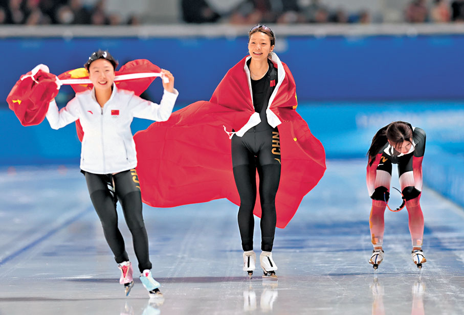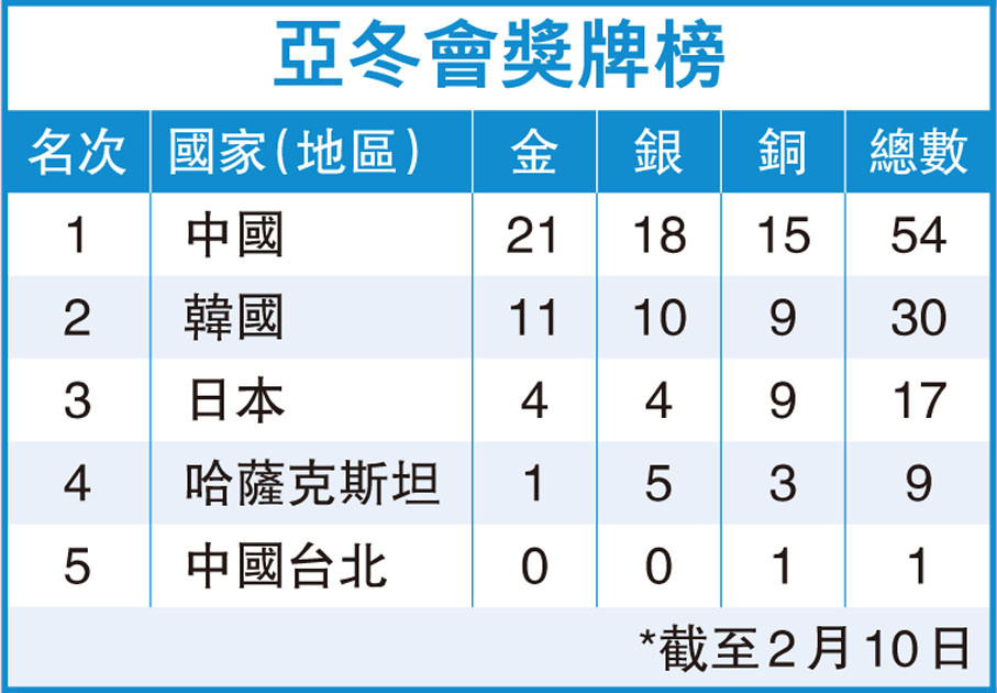 哈爾濱亞冬會速度滑冰女子3,000米比賽於昨日舉行,結果3中國女將楊濱瑜、韓梅和太智恩表現出色,其中小將楊濱瑜以4分08秒54獲得冠軍,韓梅和太智恩則分列2、3名。中國速度滑冰隊也繼女子1,500米和男子5,000米賽事後,在本屆亞冬會上第三次包攬金銀銅牌。●香港文匯報記者 王欣欣、于海江 哈爾濱報道