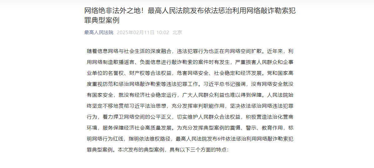 近年來,利用網絡製造散播謠言、負面信息進行敲詐勒索的案件時有發生,嚴重損害人民群眾和企事業單位的名譽權、財產權等合法權益,危害網絡安全、社會穩定和經濟發展。今天,最高人民法院發布6件依法懲治利用網絡敲詐勒索犯罪典型案例。