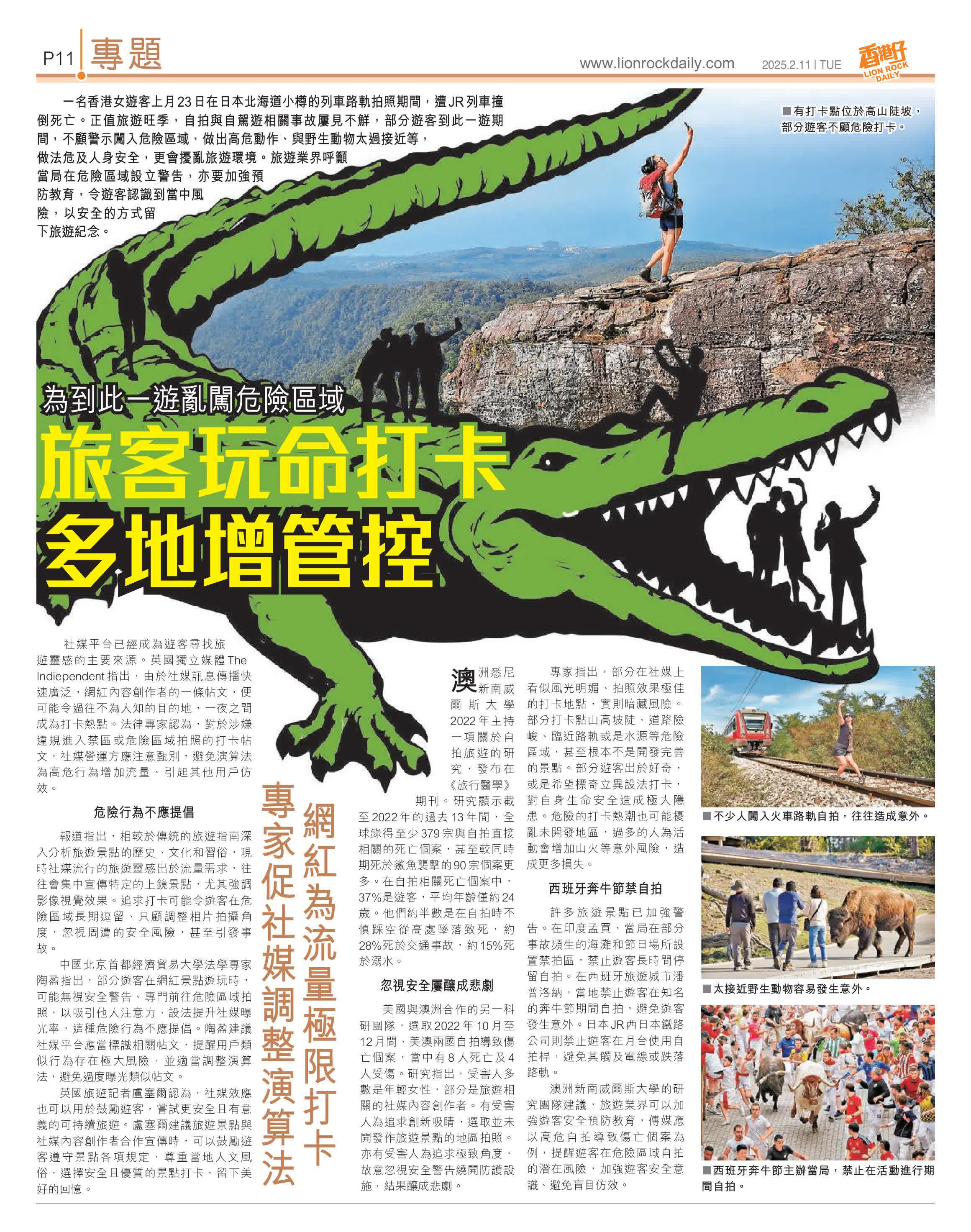 專家指出,部分在社媒上看似風光明媚、拍照效果極佳的打卡地點,實則暗藏風險。部分打卡點山高坡陡、道路險峻、臨近路軌或是水源等危險區域,甚至根本不是開發完善的景點。部分遊客出於好奇,或是希望標奇立異設法打卡,對自身生命安全造成極大隱患。危險的打卡熱潮也可能擾亂未開發地區,過多的人為活動會增加山火等意外風險,造成更多損失。