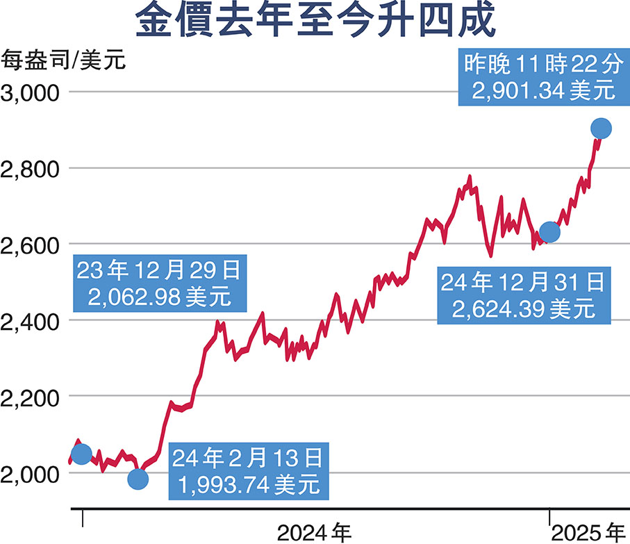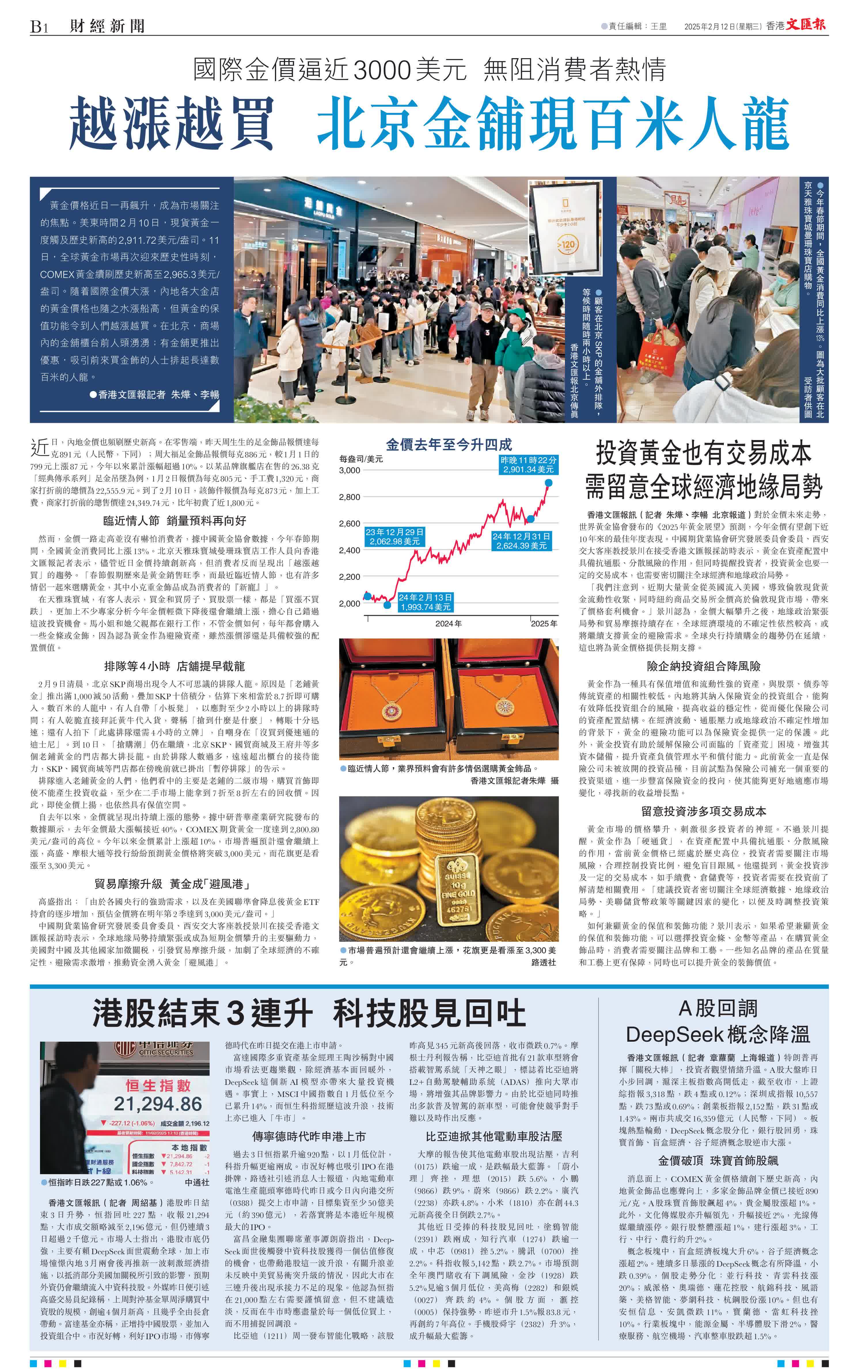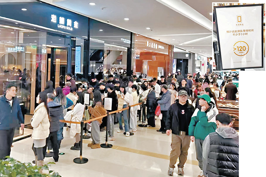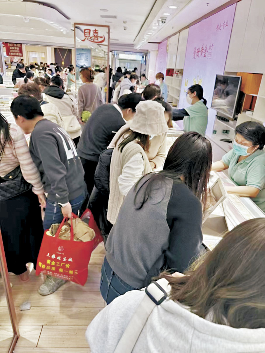 (香港文匯報記者 朱燁、李暢)黃金價格近日一再飆升,成為市場關注的焦點。美東時間2月10日,現貨黃金一度觸及歷史新高的2,911.72美元/盎司。11日,全球黃金市場再次迎來歷史性時刻,COMEX黃金續刷歷史新高至2,965.3美元/盎司。隨着國際金價大漲,內地各大金店的黃金價格也隨之水漲船高,但黃金的保值功能令到人們越漲越買。在北京,商場內的金舖櫃台前人頭湧湧;有金舖更推出優惠,吸引前來買金飾的人士排起長達數百米的人龍。
