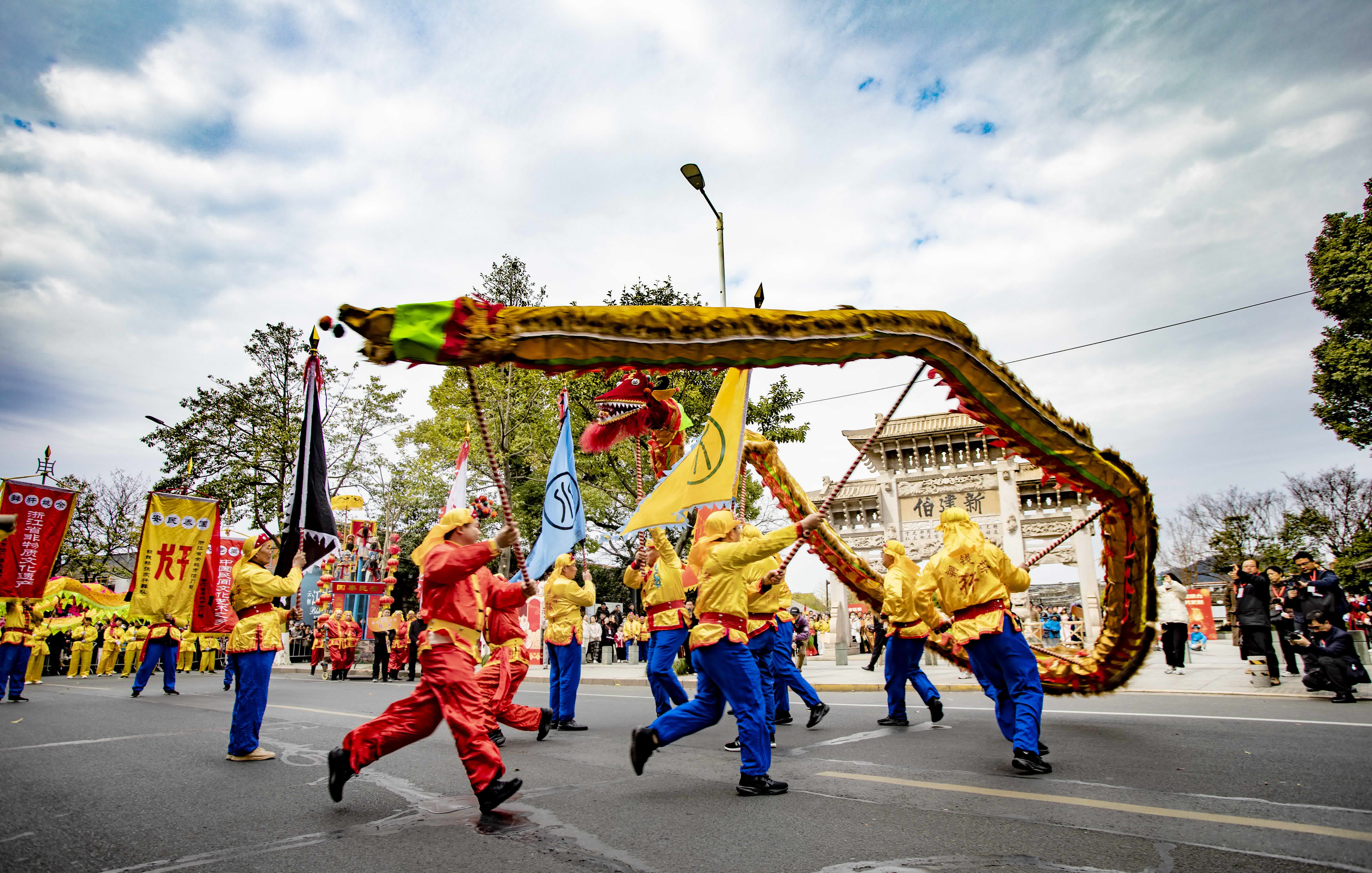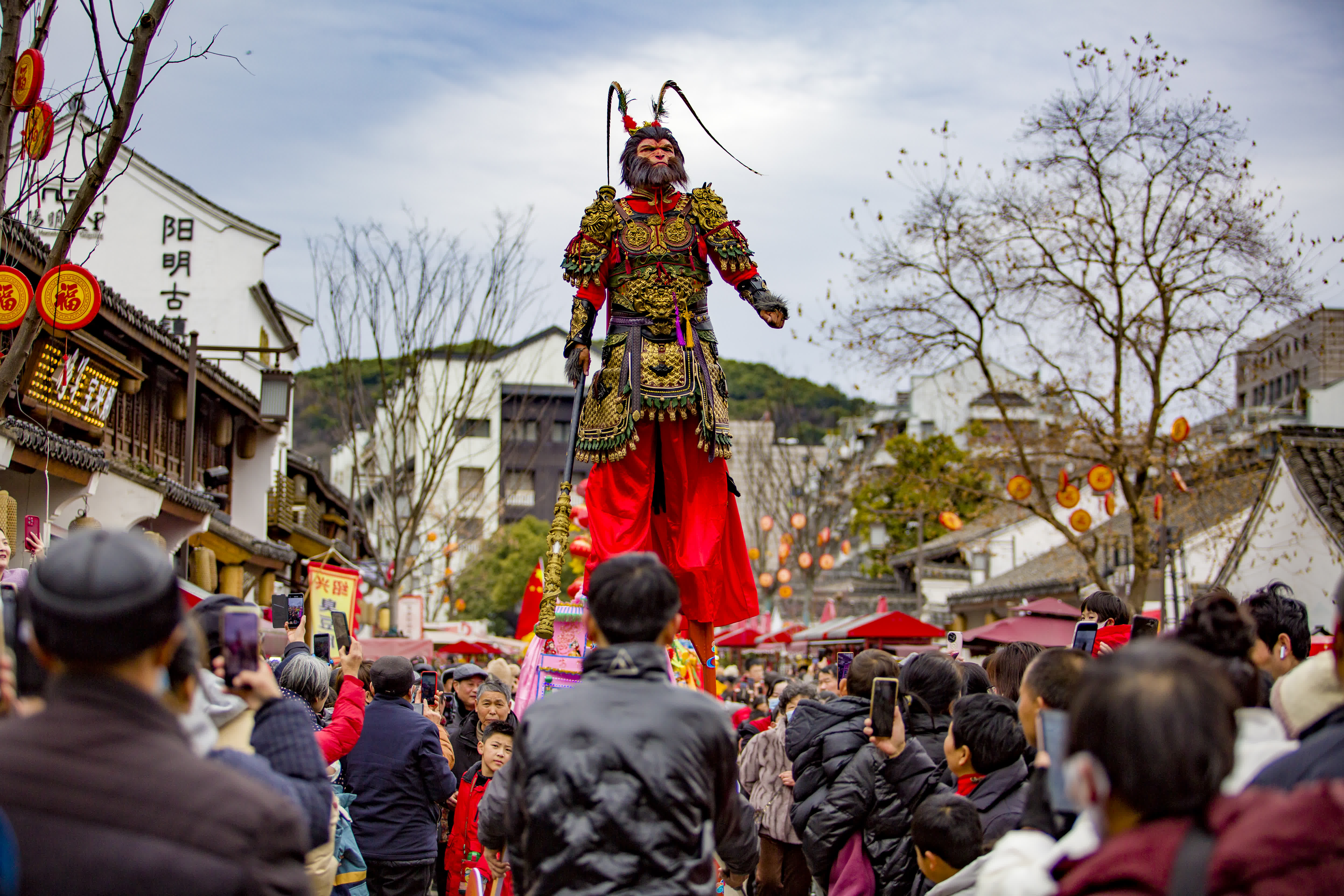 下午1點,由250餘名表演者組成的巡遊隊伍,從王陽明故居廣場出發,沿着陽明西路、新建北路、通濟橋舜江樓一路前行。巡遊隊伍中,非遺犴舞、綳龍、抬閣、車子燈等項目依次登場,演員們身着精美服飾,手持各種非遺道具,將余姚的傳統文化展現得淋漓盡致。