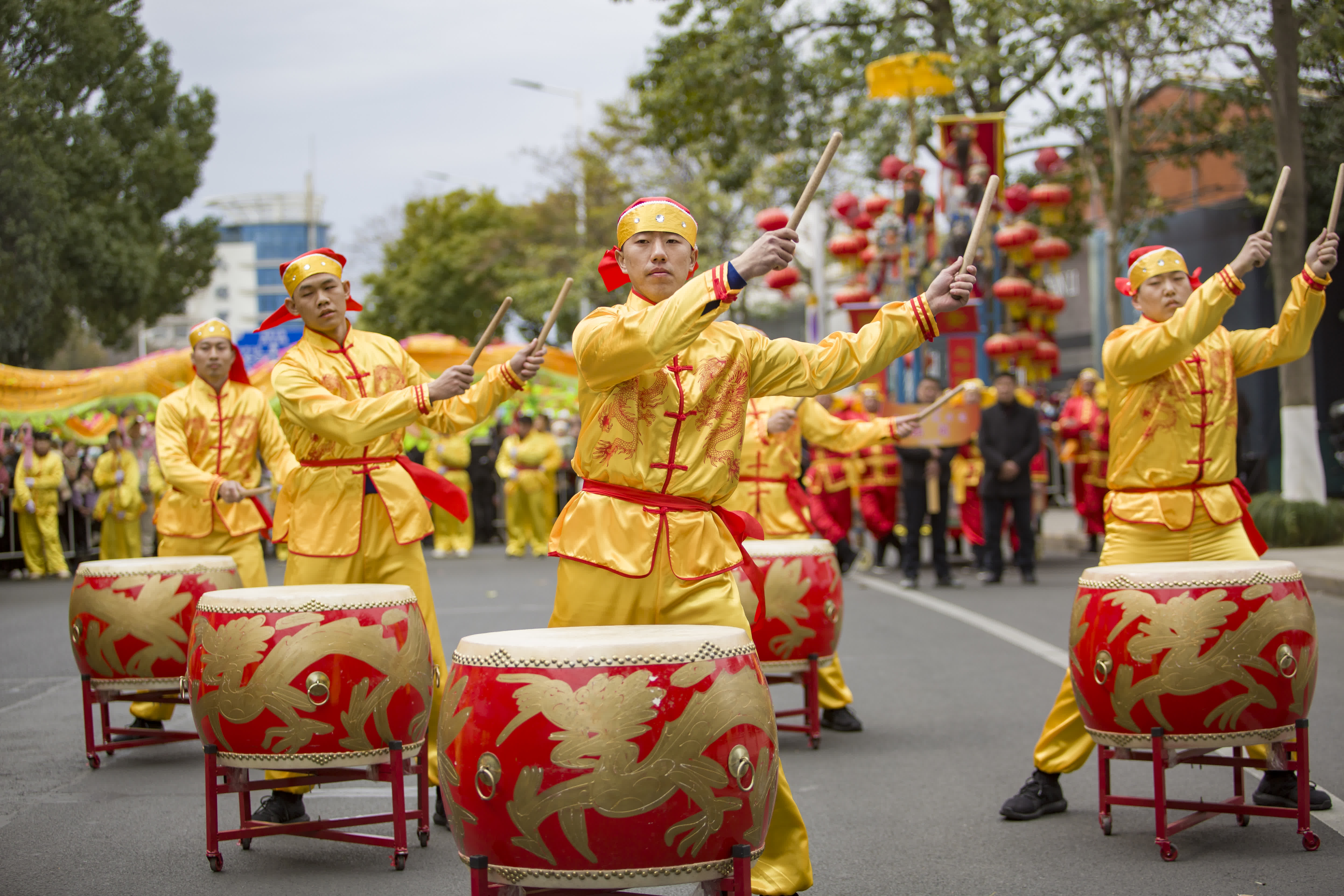 中午12:30,王陽明故居廣場上鑼鼓喧天,龍騰獅躍,熱鬧非凡。隨着嘹亮的鼓聲響起,主題展演正式拉開帷幕,鼓樂表演《盛世歡騰》,非遺項目表演「犴舞」「余姚十番」輪番登場,將現場氣氛推向高潮。