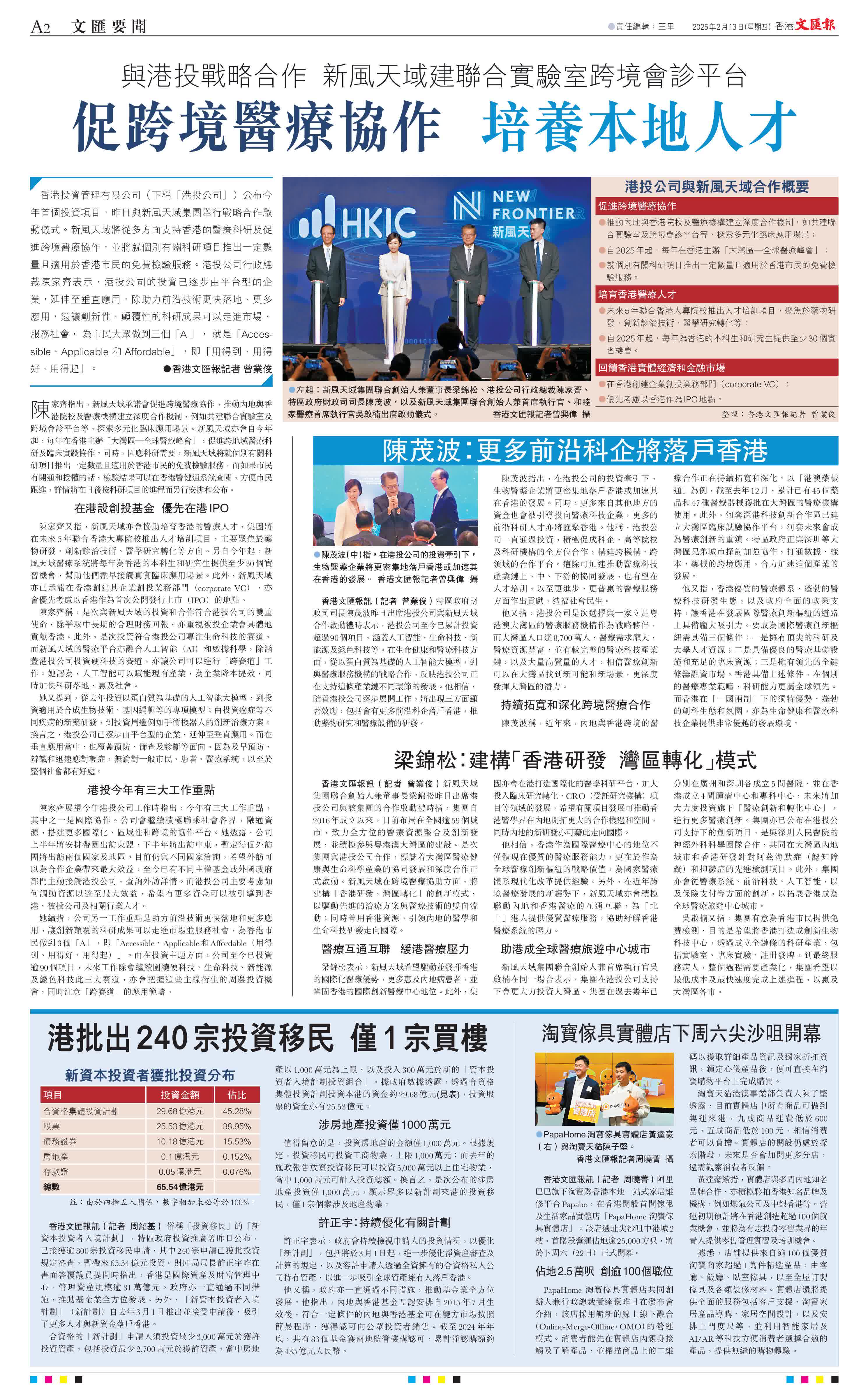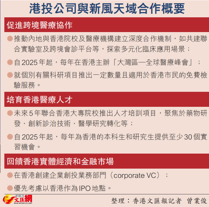 (香港文匯報記者 曾業俊)香港投資管理有限公司(下稱「港投公司」)公布今年首個投資項目,昨日與新風天域集團舉行戰略合作啟動儀式。新風天域將從多方面支持香港的醫療科研及促進跨境醫療協作,並將就個別有關科研項目推出一定數量且適用於香港市民的免費檢驗服務。港投公司行政總裁陳家齊表示,港投公司的投資已逐步由平台型的企業,延伸至垂直應用,除助力前沿技術更快落地、更多應用,還讓創新性、顛覆性的科研成果可以走進市場、服務社會, 為市民大眾做到三個「A 」, 就是「Accessible、Applicable 和 Affordable」,即「用得到、用得好、用得起」。