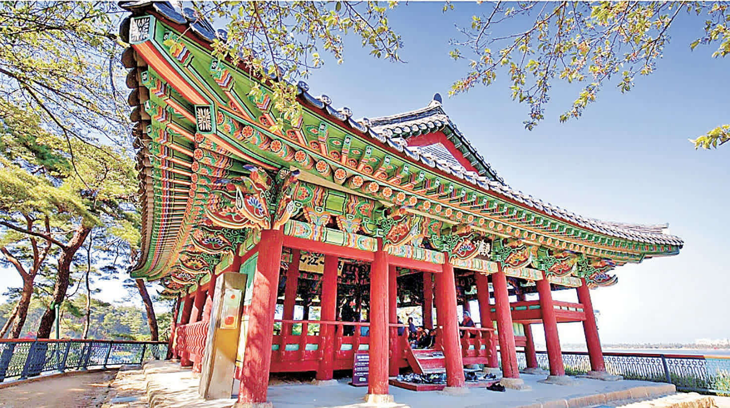 鏡浦湖是江陵市最著名的景點之一,以其絕美的湖景而聞名。湖畔的亭台樓閣映襯着湖水,如詩如畫。鏡浦湖是與大海相連的自然湖,佔地面積約126萬平方米,因湖水像鏡子一樣清澈而得名「鏡浦」。尤其這裏是知名的冬季候鳥遷徙地(綠頭鴨、鴛鴦等),因同時具有美麗大自然與傳統文化,而成為韓國人心目中理想的度假兼休養勝地。