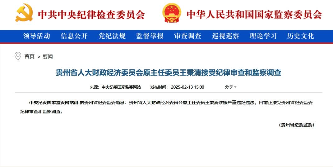 據貴州省紀委監委消息:貴州省人大財政經濟委員會原主任委員王秉清涉嫌嚴重違紀違法,目前正接受貴州省紀委監委紀律審查和監察調查。