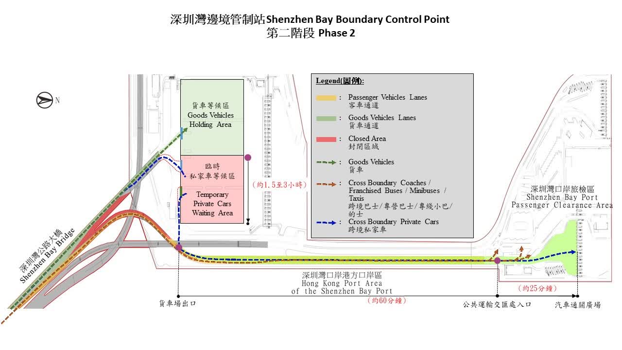 ─除第二階段已實施的交通安排外,跨境私家車須按指示進入預設等候區;及