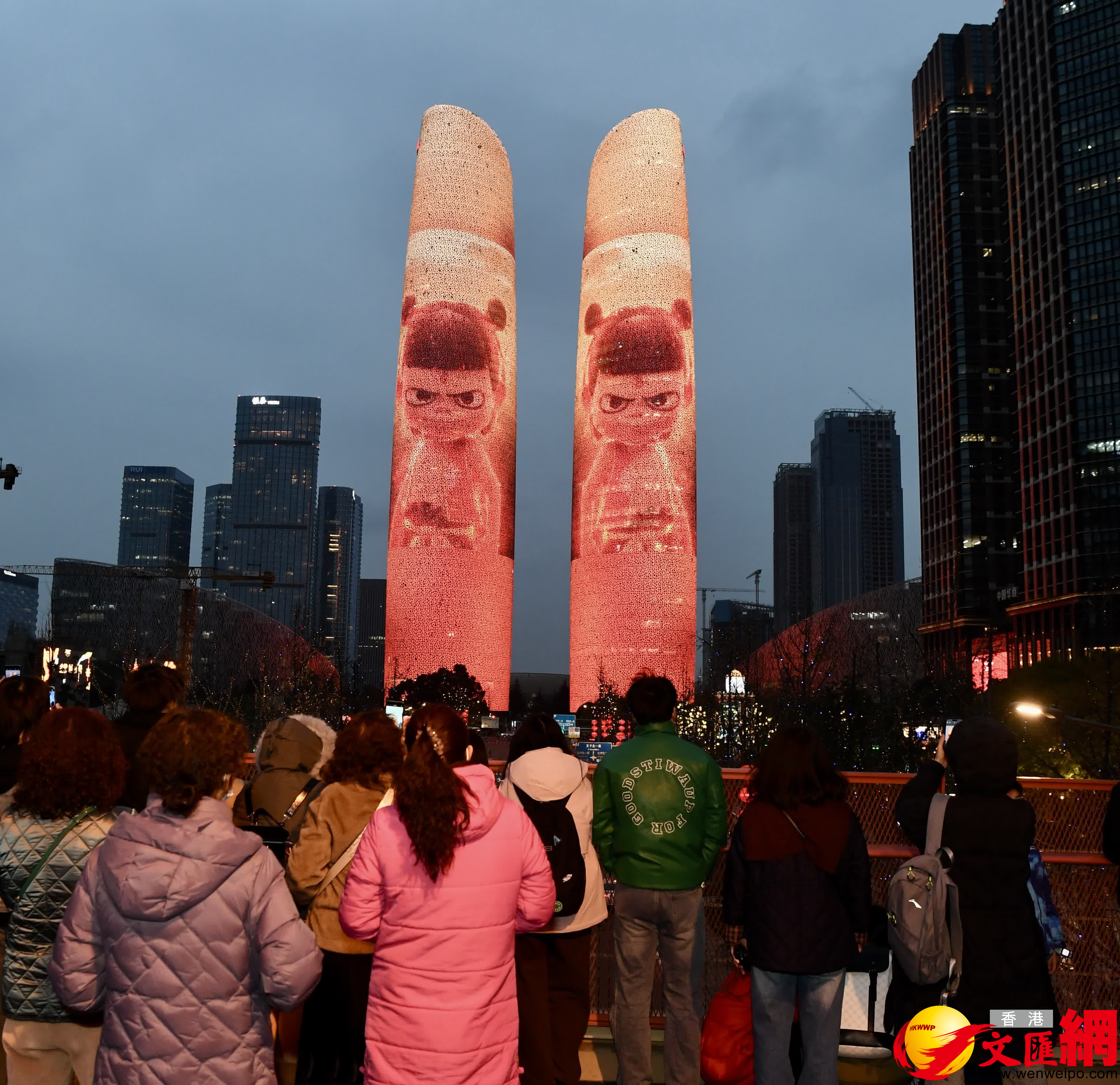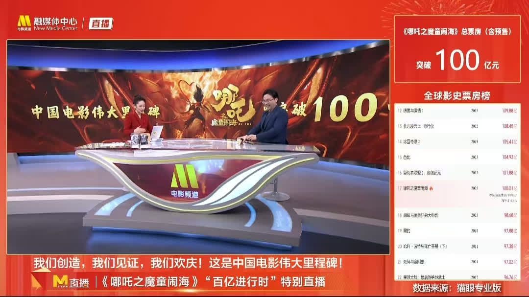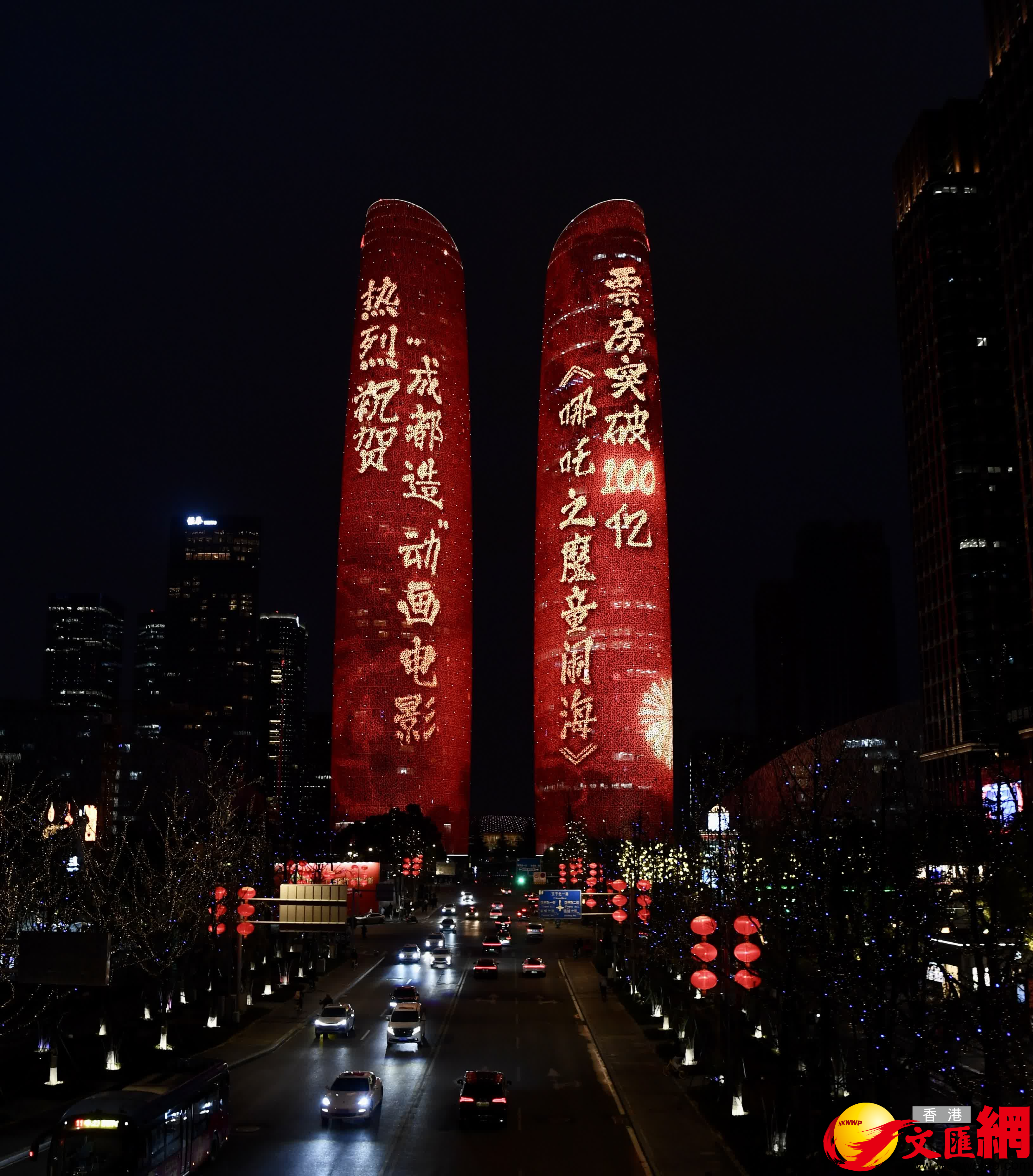 當日晚間,「哪吒」和「敖丙」登上成都地標建築天府雙塔,「熱烈祝賀『成都造』動畫電影《哪吒之魔童鬧海》票房突破一百億」的光影字樣則記錄下了這個歷史性時刻。