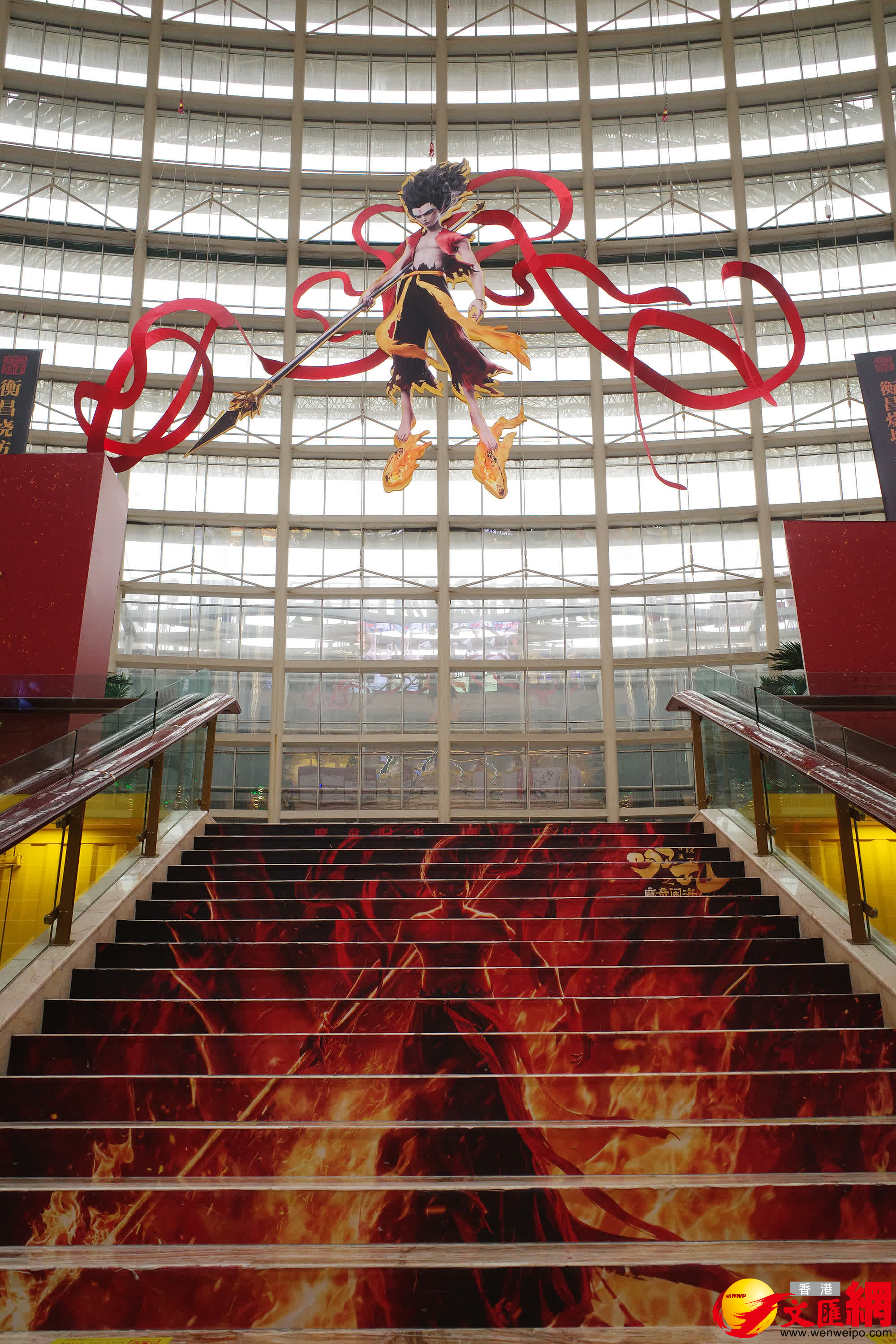 在成都環球中心,近10米高的「哪吒」手持火尖槍、身披混天綾、腳踏風火輪,威風凜凜;在交子大道上,由哪吒、敖丙、太乙真人、申公豹、李靖、殷夫人、結界獸等組成的雕塑群引得大家駐足拍照……