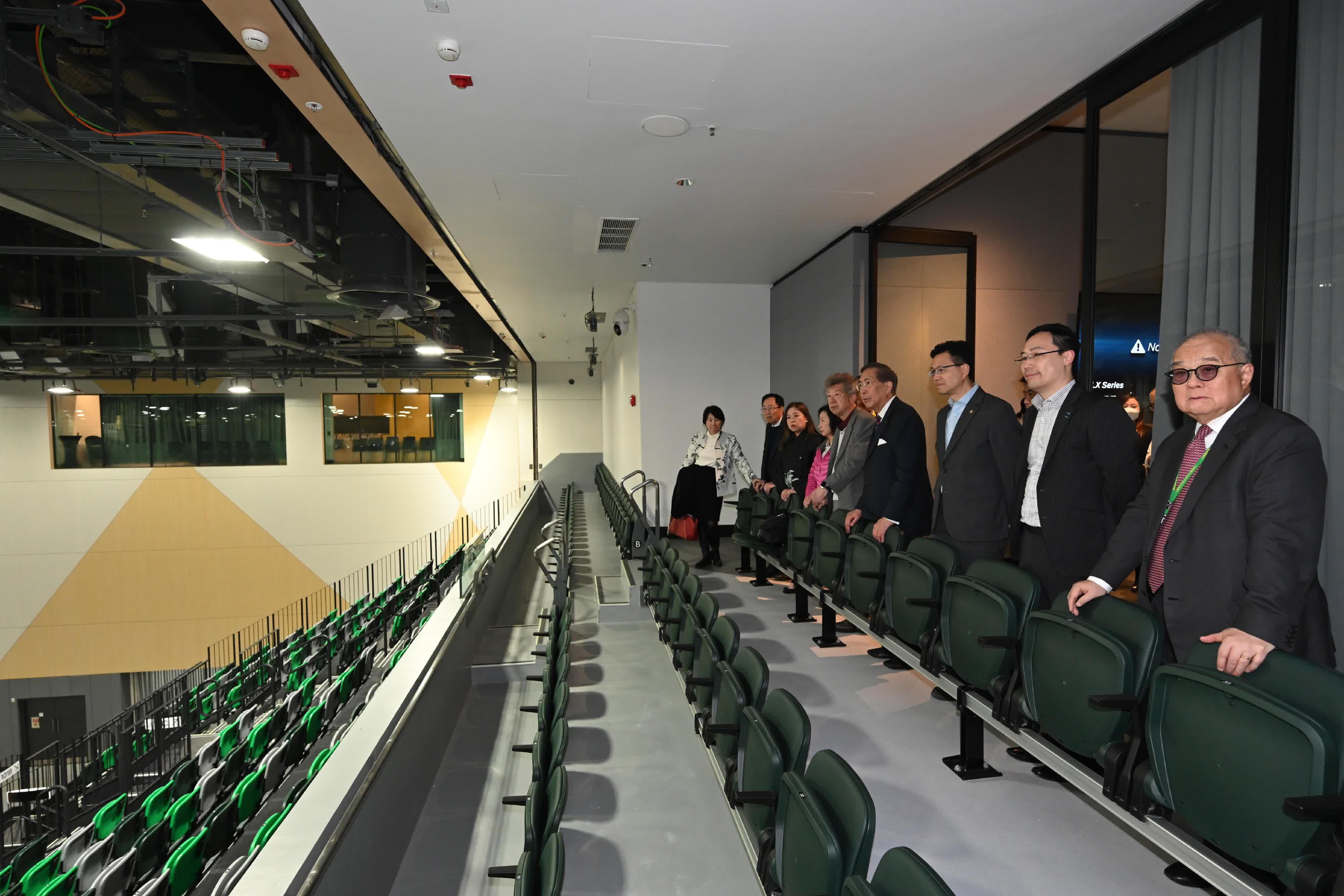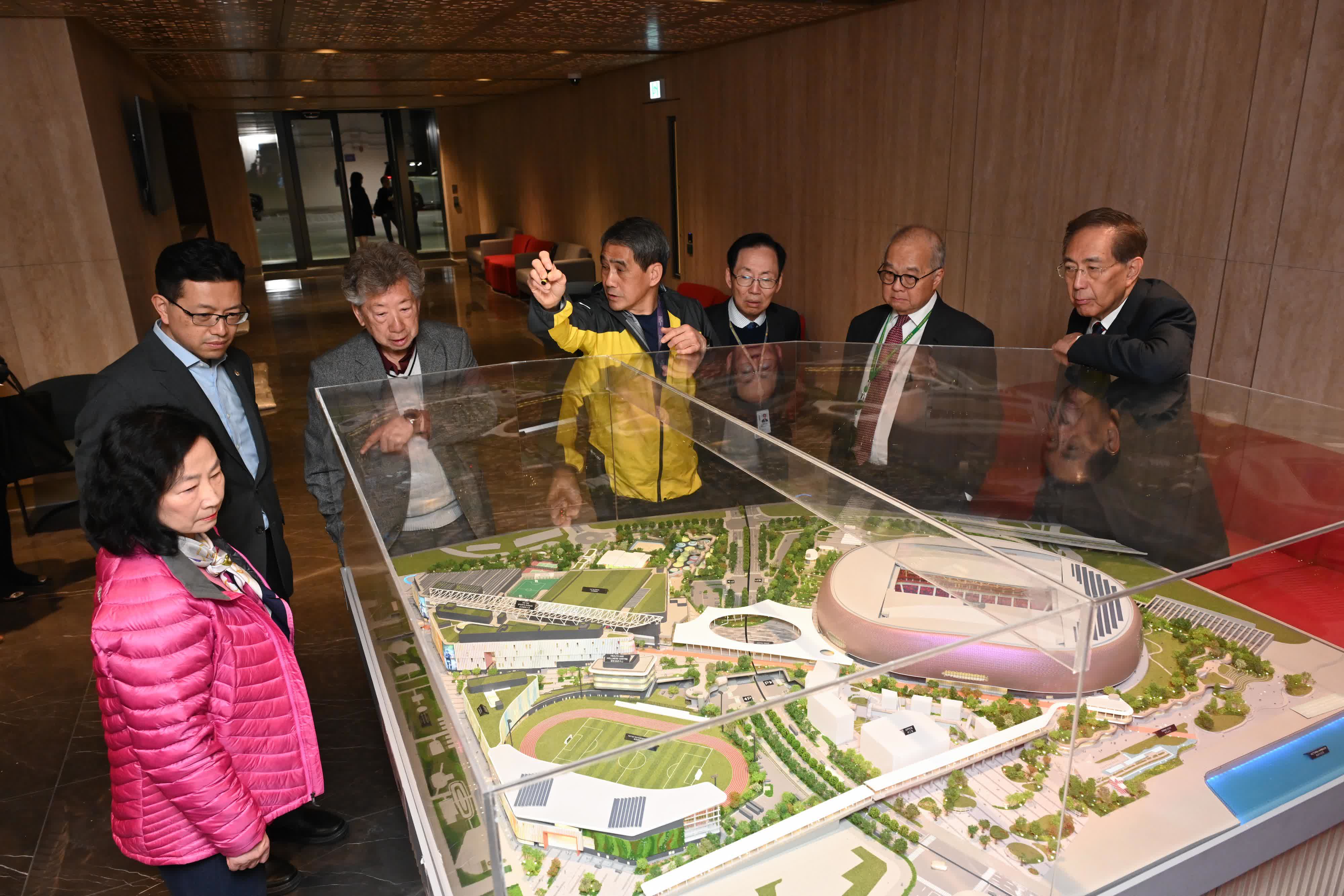行會非官守議員在文化體育及旅遊局局長羅淑佩、文體旅局常任秘書長沈鳳君和體育專員蔡健斌陪同下,在啟德體育園聽取工作人員介紹園區設計和規劃。