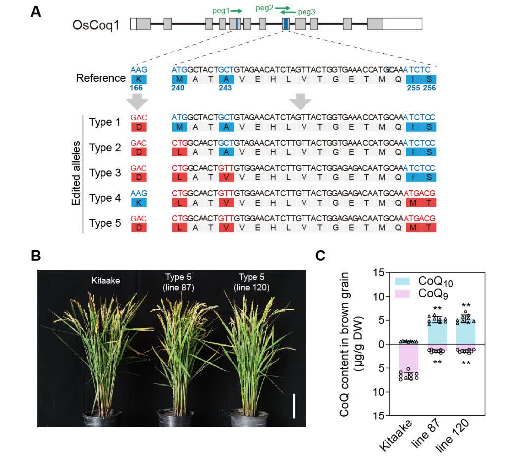 結合對1000多種陸生植物輔酶Q側鏈合成酶Coq1氨基酸序列的進化分析和機器學習,科研團隊最終確定了決定鏈長的5個氨基酸位點。再通過精準的基因編輯,創製了主要合成輔酶Q10的水稻。實際種植表明,水稻的生長和產量均未受影響。