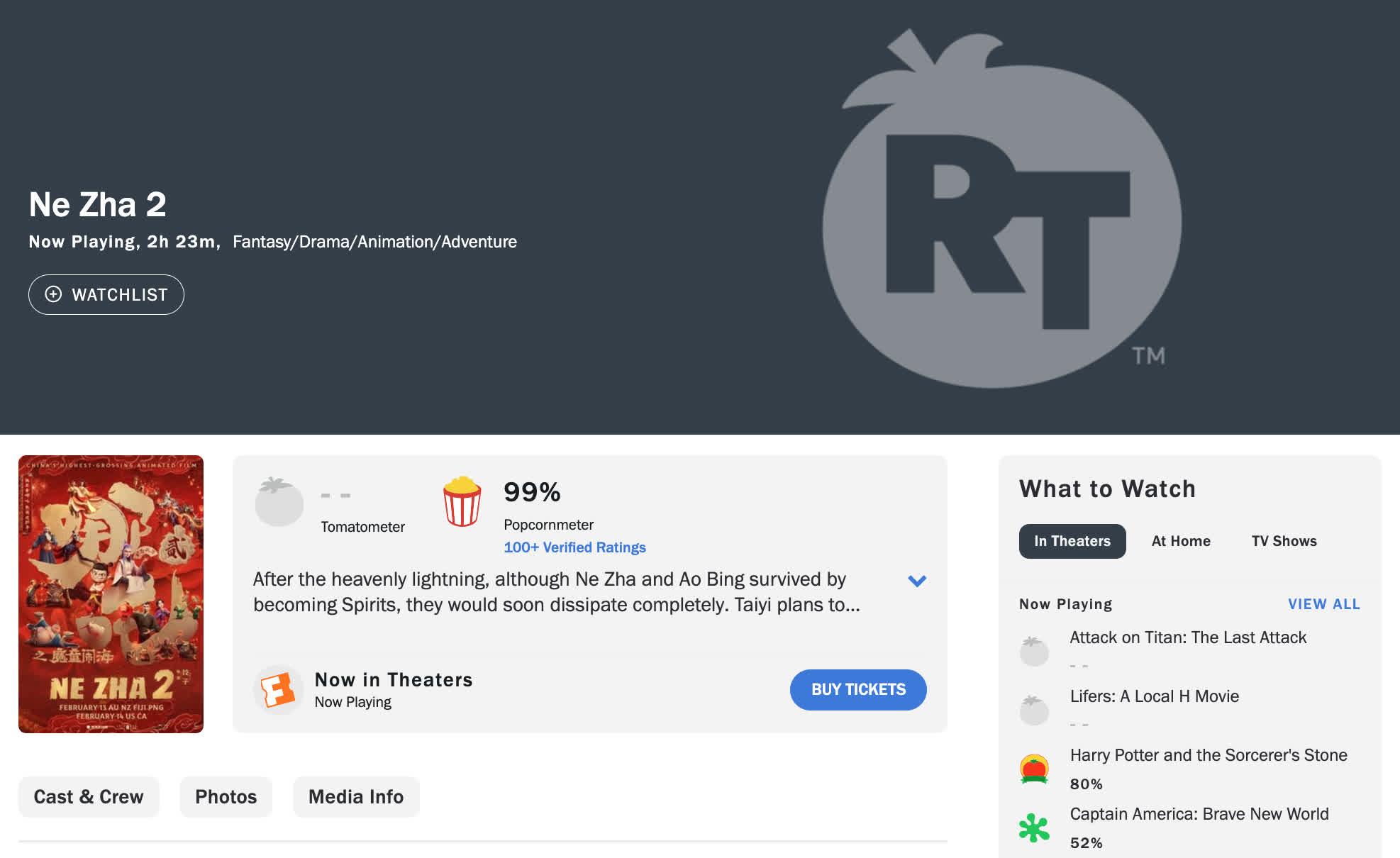 電影《哪吒之魔童鬧海》(《哪吒2》)爆火,並走向海外。記者14日查看國際知名影評網站「爛番茄」發現,《哪吒2》爆米花指數(觀眾評價)達到99%。有用戶評價,「絕對是2025年最佳影片。」「令人驚嘆,每個打鬥場景都充滿了活力和細節。」據悉,《哪吒2》將於2月14日在北美院線全面上映。