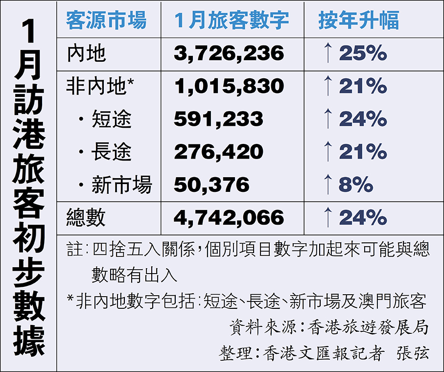 香港旅遊發展局表示,今年1月受惠於農曆新年假期以及香港多項新春大型盛事等正面氣氛的帶動,初步訪港旅客數字為474萬人次,按年增加24%,其中內地旅客佔373萬人次,較去年同期有25%的升幅,兩項數字均創新冠疫情後單月訪港旅客量的新高。
