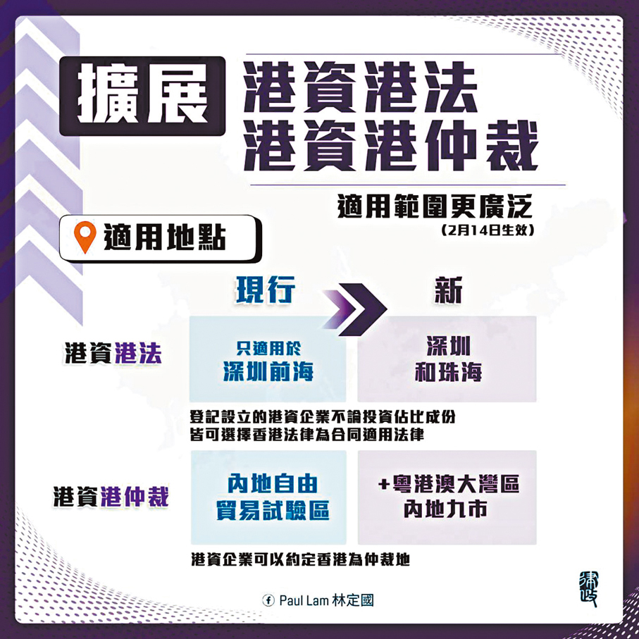 香港特區政府律政司司長林定國昨日在社交平台發帖表示,《意見》中即日起生效的新措施,進一步擴大「港資港法」與「港資港仲裁」的適用範圍,為粵港澳大灣區的投資者與企業提供更多、更靈活的法律服務選擇,並強化區內商事糾紛的解決機制。這些措施的推出,是對去年10月CEPA《修訂協議二》內容的落實,能為大灣區投資者及企業提供更多、更寬闊的法律服務選擇,亦能更好建立共商、共建、共享的多元化糾紛解決機制。