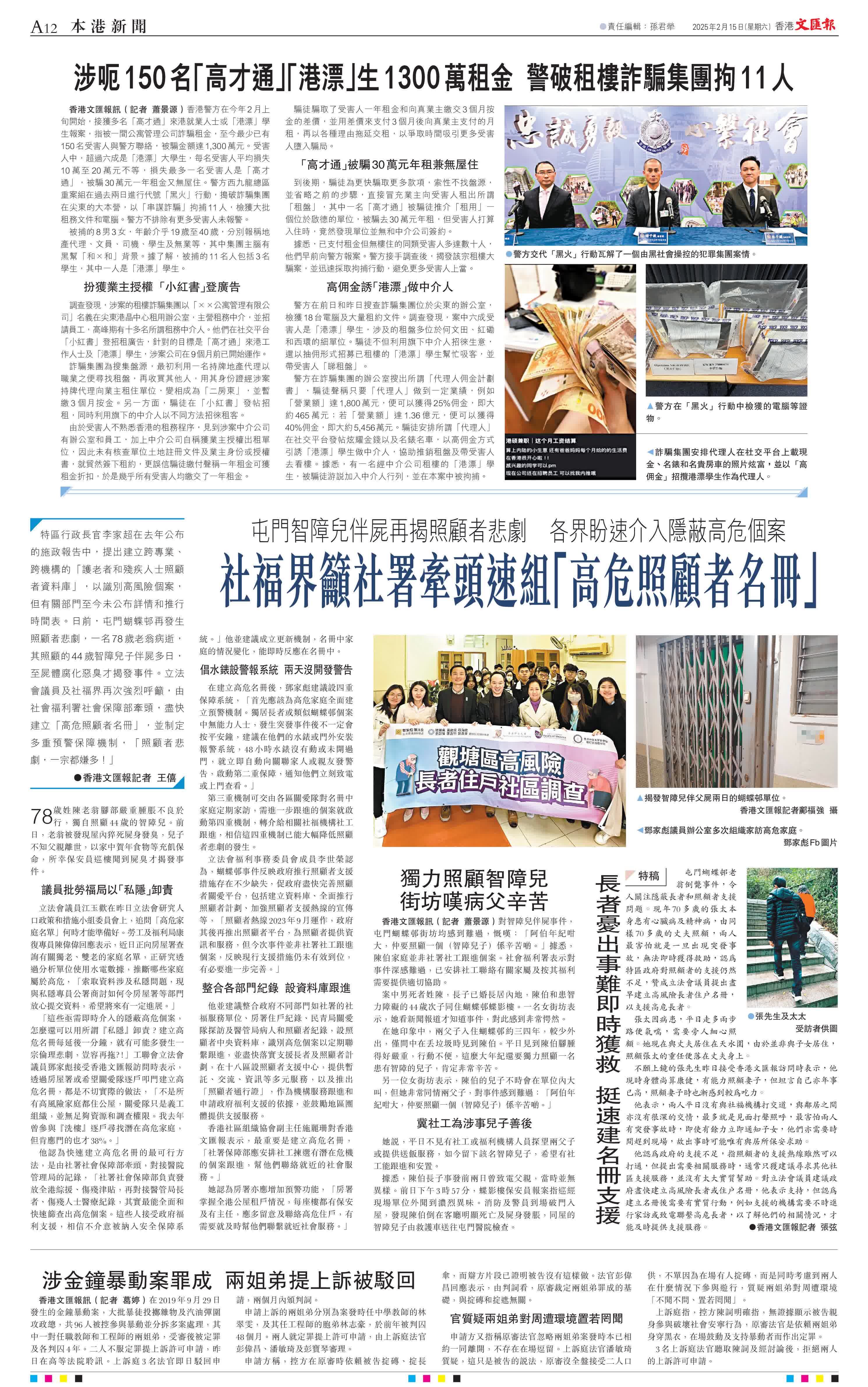 (香港文匯報記者 王僖)特區行政長官李家超在去年公布的施政報告中,提出建立跨專業、跨機構的「護老者和殘疾人士照顧者資料庫」,以識別高風險個案,但有關部門至今未公布詳情和推行時間表。日前,屯門蝴蝶邨再發生照顧者悲劇,一名78歲老翁病逝,其照顧的44歲智障兒子伴屍多日,至屍體腐化惡臭才揭發事件。立法會議員及社福界再次強烈呼籲,由社會福利署社會保障部牽頭,盡快建立「高危照顧者名冊」,並制定多重預警保障機制,「照顧者悲劇,一宗都嫌多!」