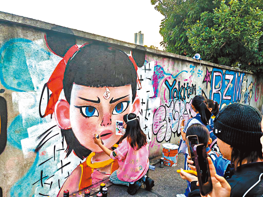 這面塗鴉牆由「00後」自由職業者彭丹與兩位朋友精心創作。13日下午,香港文匯報記者抵達現場時,彭丹正全神貫注地繪製靈珠版的哪吒形象,周圍人群熙攘,市民們紛紛駐足觀賞、打卡拍照。