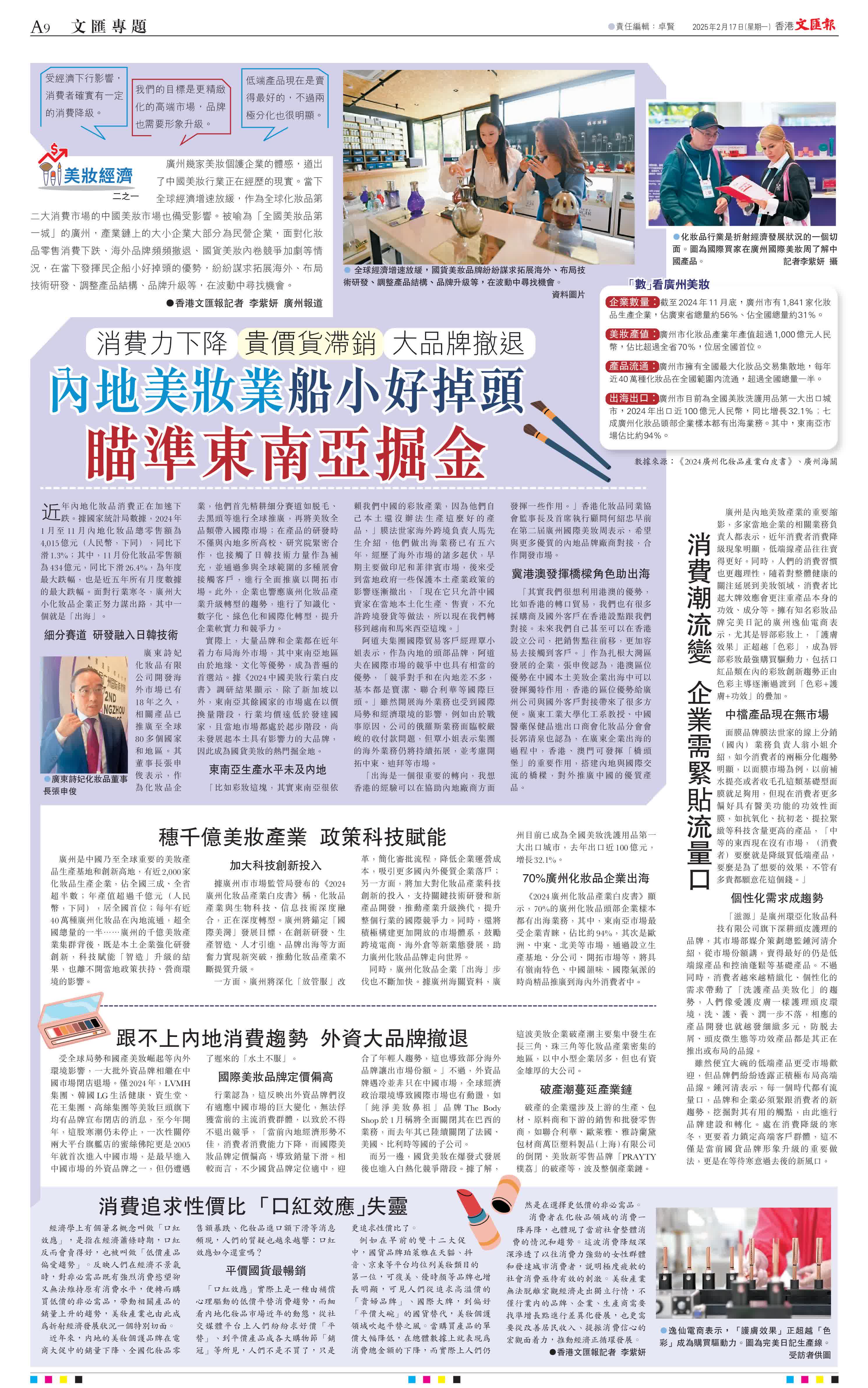 (香港文匯報記者 李紫妍 廣州報道)廣州幾家美妝個護企業的體感,道出了中國美妝行業正在經歷的現實。當下全球經濟增速放緩,作為全球化妝品第二大消費市場的中國美妝市場也備受影響。被喻為「全國美妝品第一城」的廣州,產業鏈上的大小企業大部分為民營企業,面對化妝品零售消費下跌、海外品牌頻頻撤退、國貨美妝內卷競爭加劇等情況,在當下發揮民企船小好掉頭的優勢,紛紛謀求拓展海外、布局技術研發、調整產品結構、品牌升級等,在波動中尋找機會。