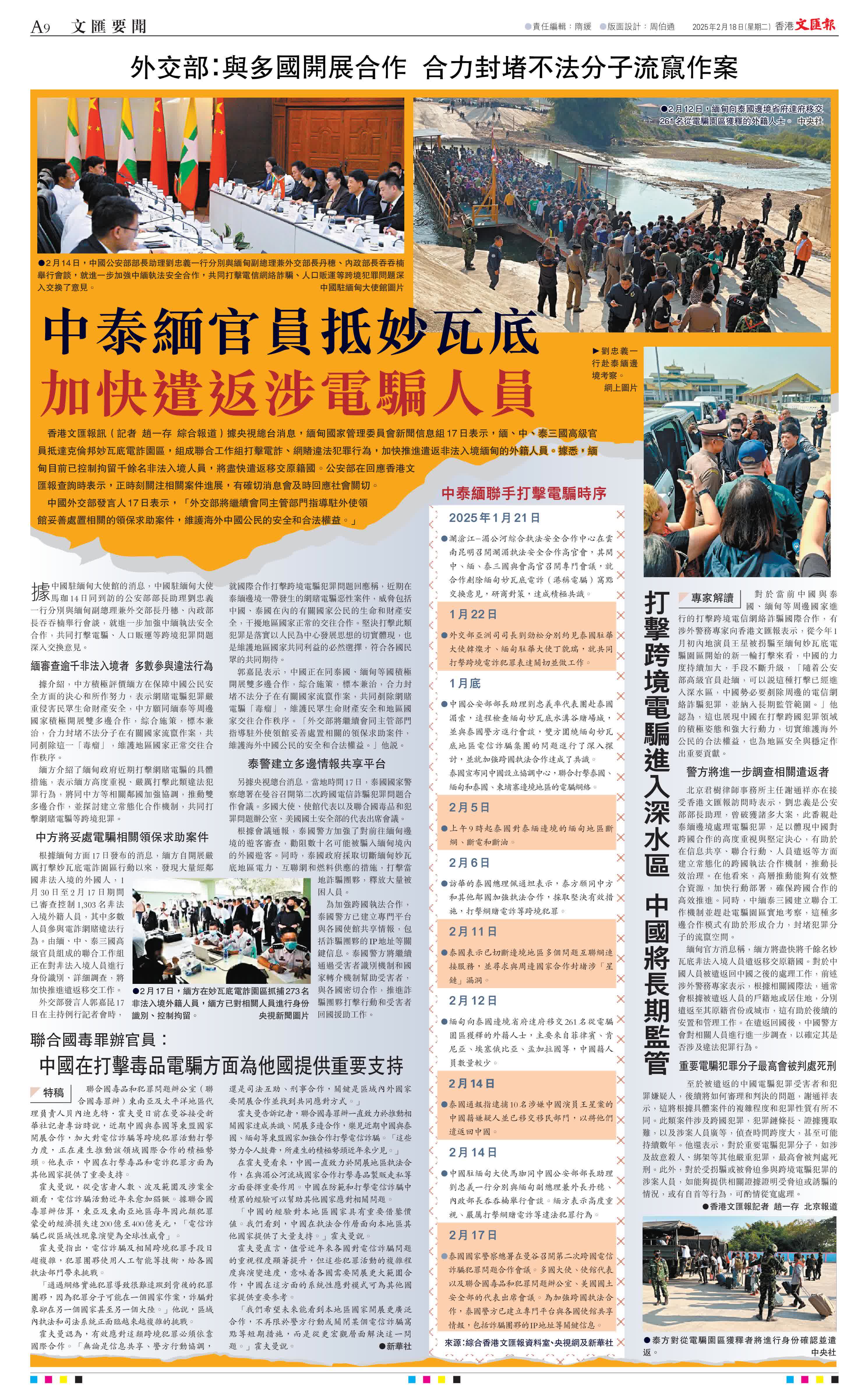 北京君樹律師事務所主任謝通祥亦在接受香港文匯報訪問時表示,劉忠義是公安部部長助理,曾破獲諸多大案,此番親赴泰緬邊境處理電騙犯罪,足以體現中國對跨國合作的高度重視與堅定決心,有助於在信息共享、聯合行動、人員遣返等方面建立常態化的跨國執法合作機制,推動長效治理。在他看來,高層推動能夠有效整合資源,加快行動部署,確保跨國合作的高效推進。同時,中緬泰三國建立聯合工作機制並趕赴電騙園區實地考察,這種多邊合作模式有助於形成合力,封堵犯罪分子的流竄空間。