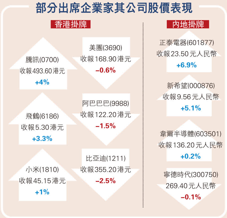 昨日多家企業的創辦人都有出席座談會,相關企業股價表現各異,阿里巴巴(9988)跌1.5%,小米(1810)升1%,比亞迪(1211)跌2.5%,美團(3690)跌0.6%,騰訊(0700)則升近4%。不過,AI概念股之一的百度(9888)創辧人李彥宏未見現身座談會,百度捱沽大挫7%。