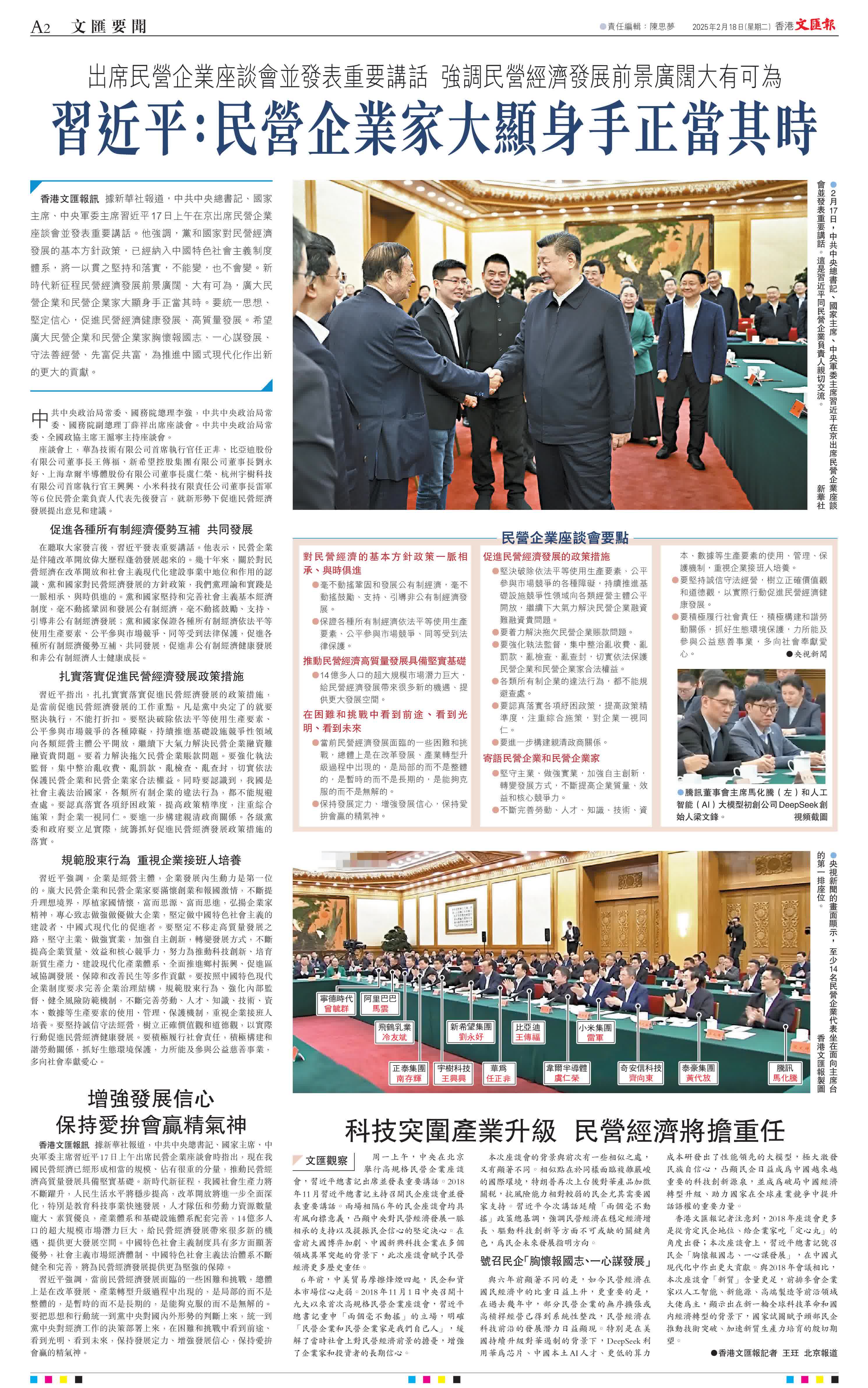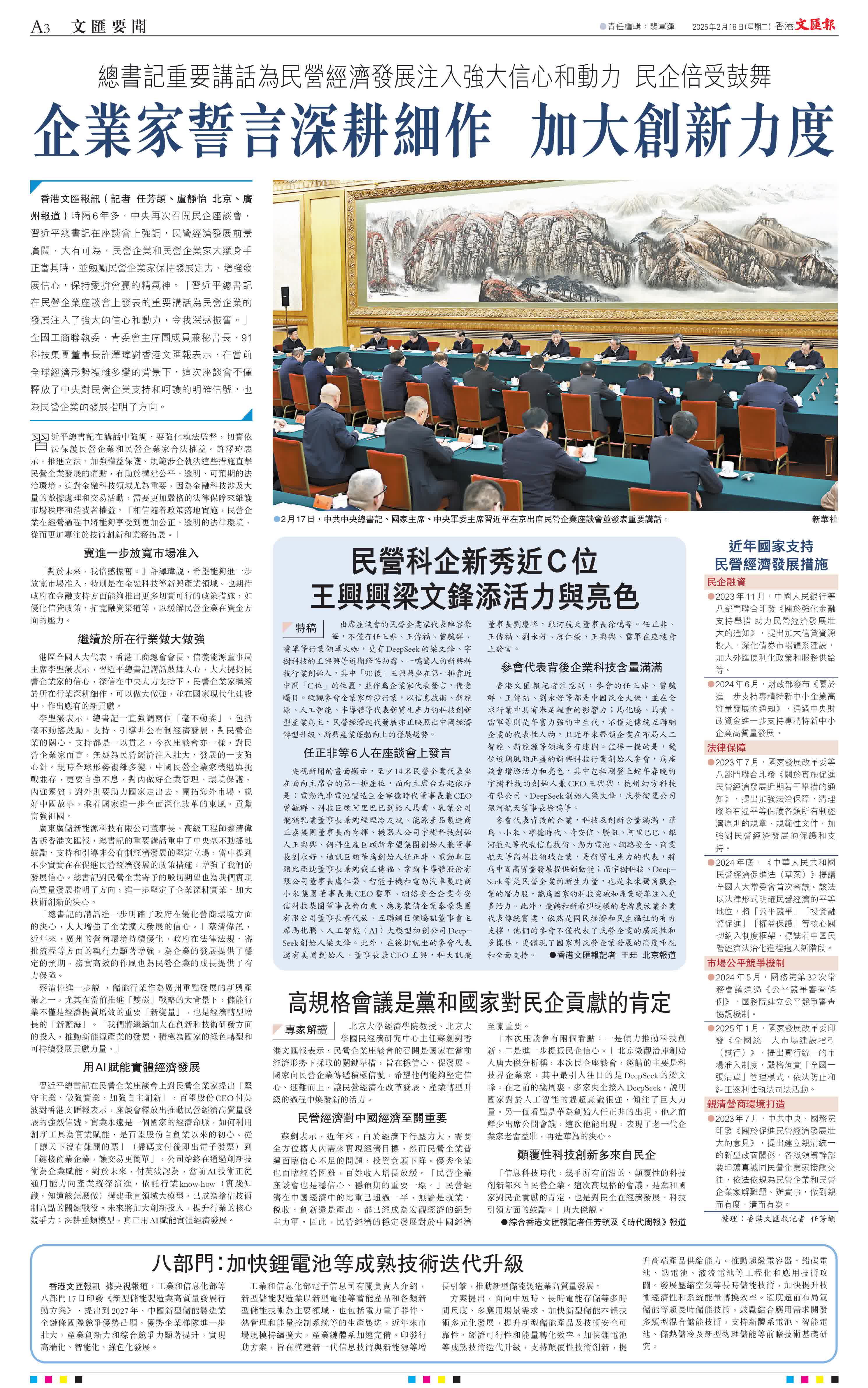 (香港文匯報記者 王玨 北京報道)出席座談會的民營企業家代表陣容豪華,不僅有任正非、王傳福、曾毓群、雷軍等行業領軍大咖,更有DeepSeek的梁文鋒、宇樹科技的王興興等近期鋒芒初露、一鳴驚人的新興科技行業創始人,其中「90後」王興興坐在第一排靠近中間「C位」的位置,並作為企業家代表發言,備受矚目。縱觀參會企業家所涉行業,以信息技術、新能源、人工智能、半導體等代表新質生產力的科技創新型產業為主,民營經濟迭代發展亦正映照出中國經濟轉型升級、新興產業蓬勃向上的發展趨勢。