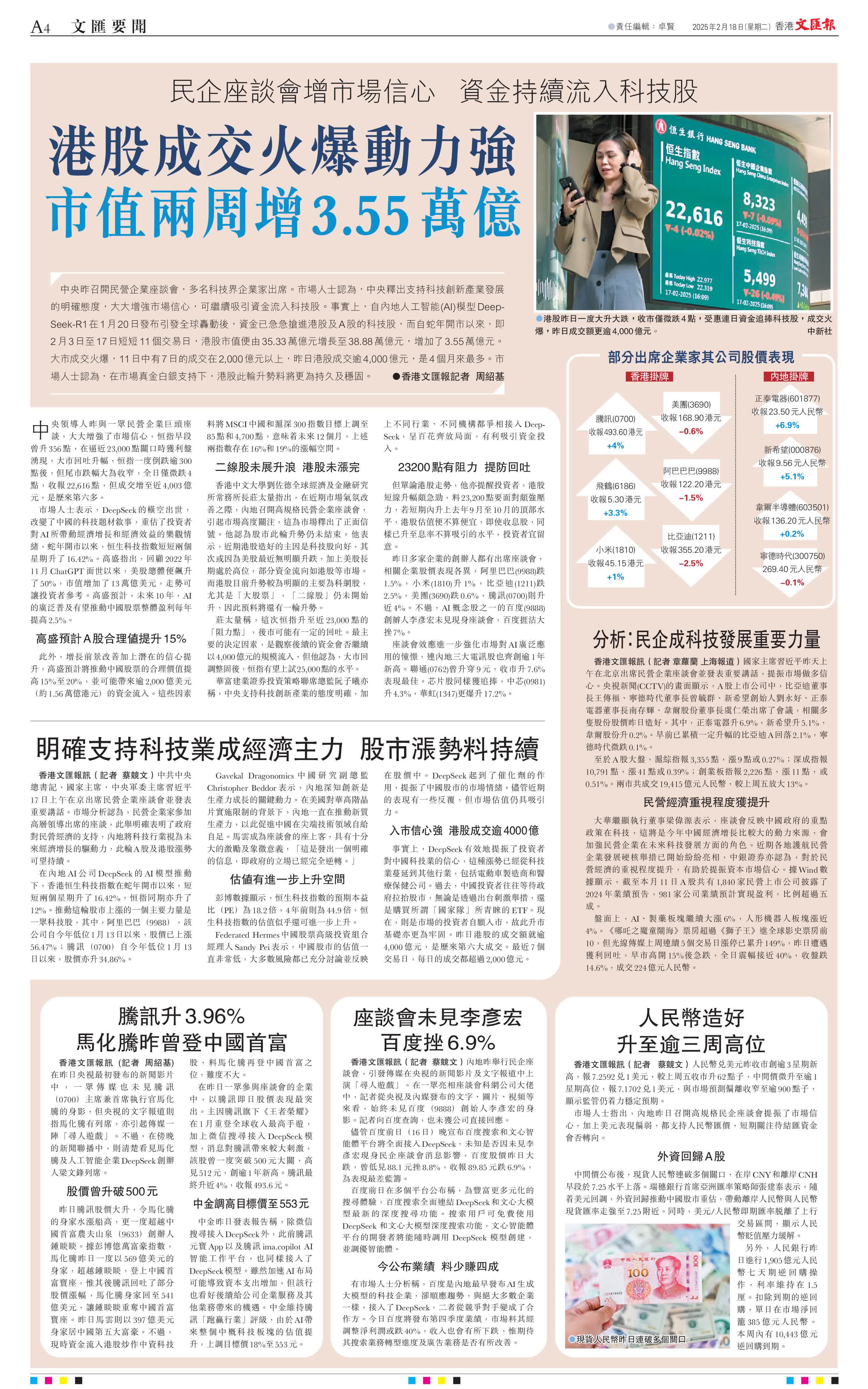 華富建業證券投資策略聯席總監阮子曦亦稱,中央支持科技創新產業的態度明確,加上不同行業、不同機構都爭相接入DeepSeek,呈百花齊放局面,有利吸引資金投入。
