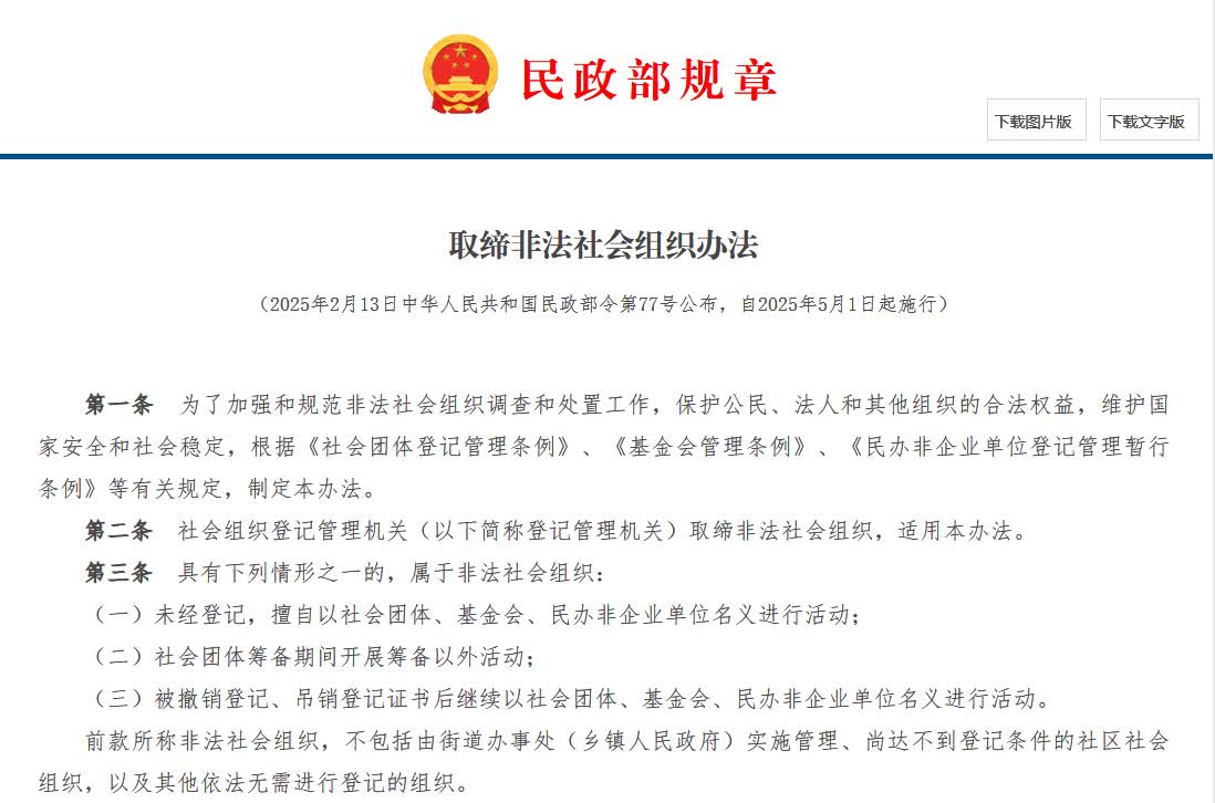 據了解,此前相關規章的名稱為《取締非法民間組織暫行辦法》,新規章調整為《取締非法社會組織辦法》,表述更為準確。