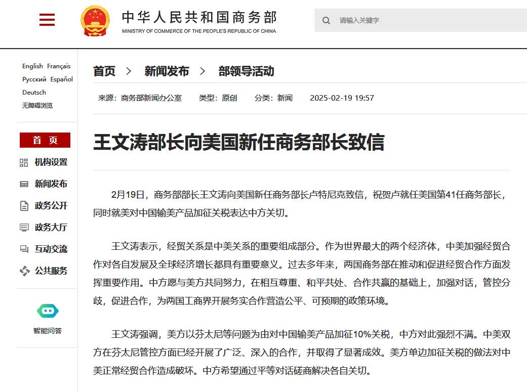 2月19日,商務部部長王文濤向美國新任商務部長盧特尼克致信,祝賀盧就任美國第41任商務部長,同時就美對中國輸美產品加徵關稅表達中方關切。