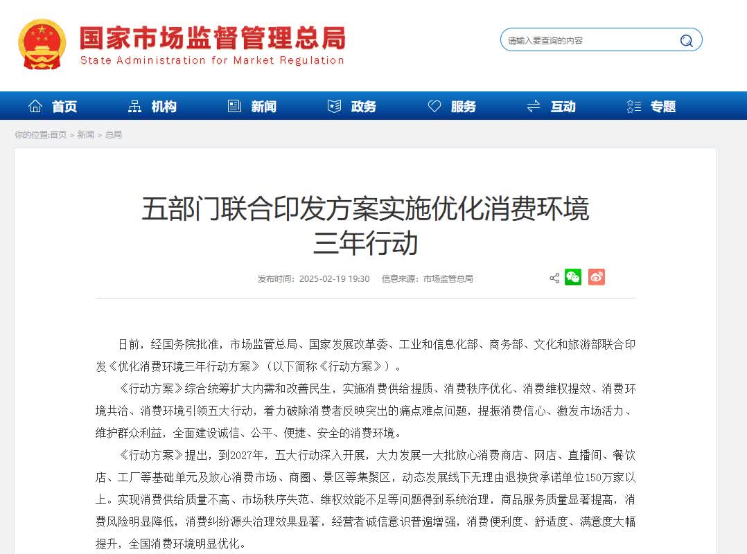記者19日從市場監管總局獲悉,市場監管總局、國家發展改革委、工業和信息化部、商務部、文化和旅遊部五部門近日印發《優化消費環境三年行動方案(2025—2027年)》,部署深入開展優化消費環境三年行動。