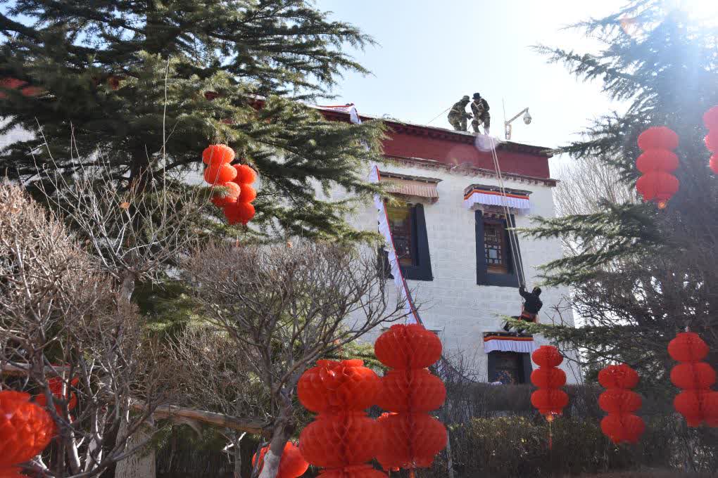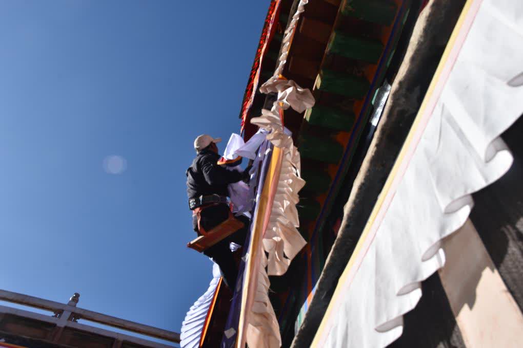 「布達拉宮門窗眾多,需要更換總長近1萬米的『香布』及數百個門簾、窗帘等。」布達拉宮管理處維修科科長扎西平措介紹,為確保在藏曆新年前完成所有工作,管理處根據往年慣例提前10天左右開始更換作業。