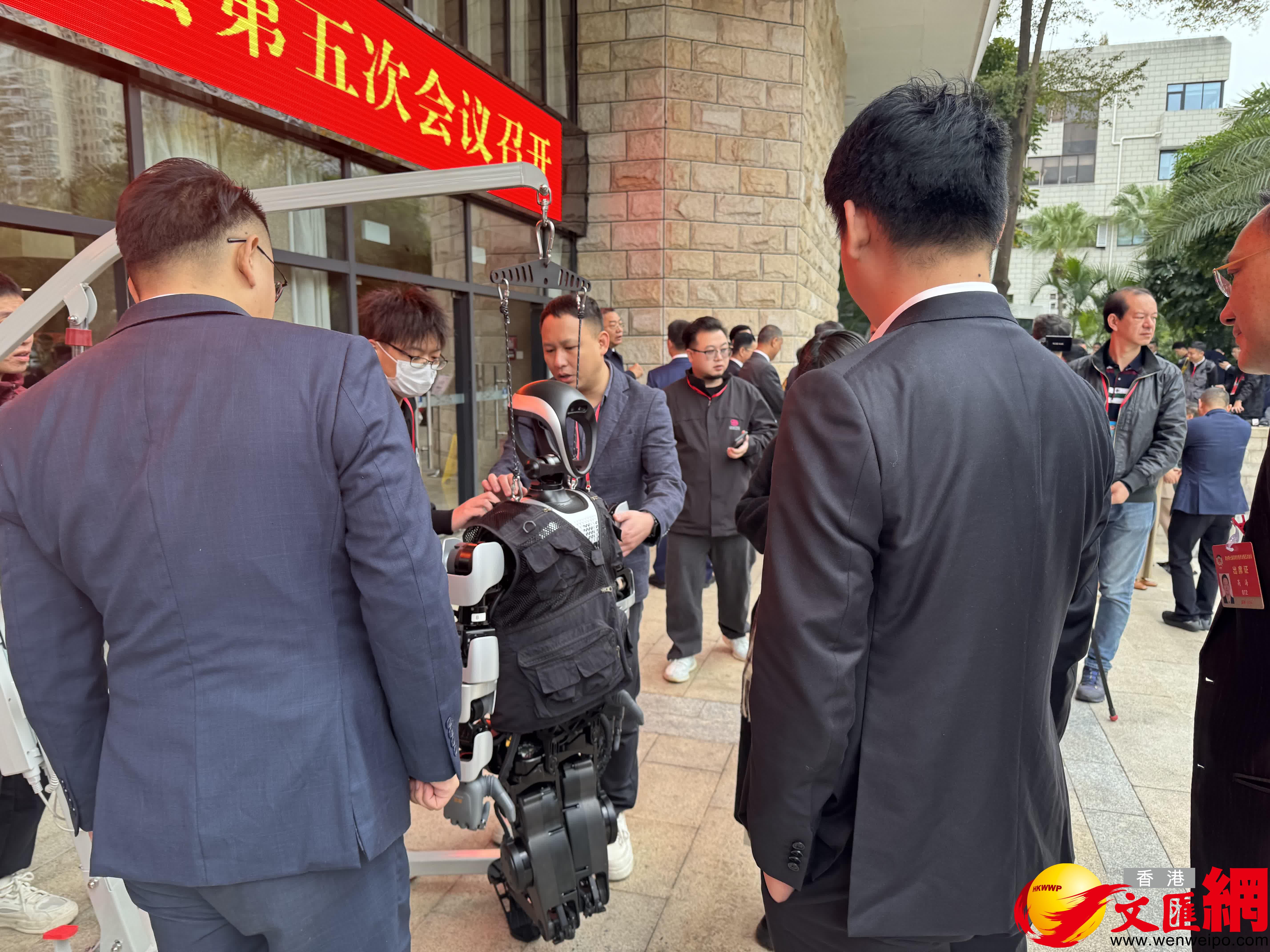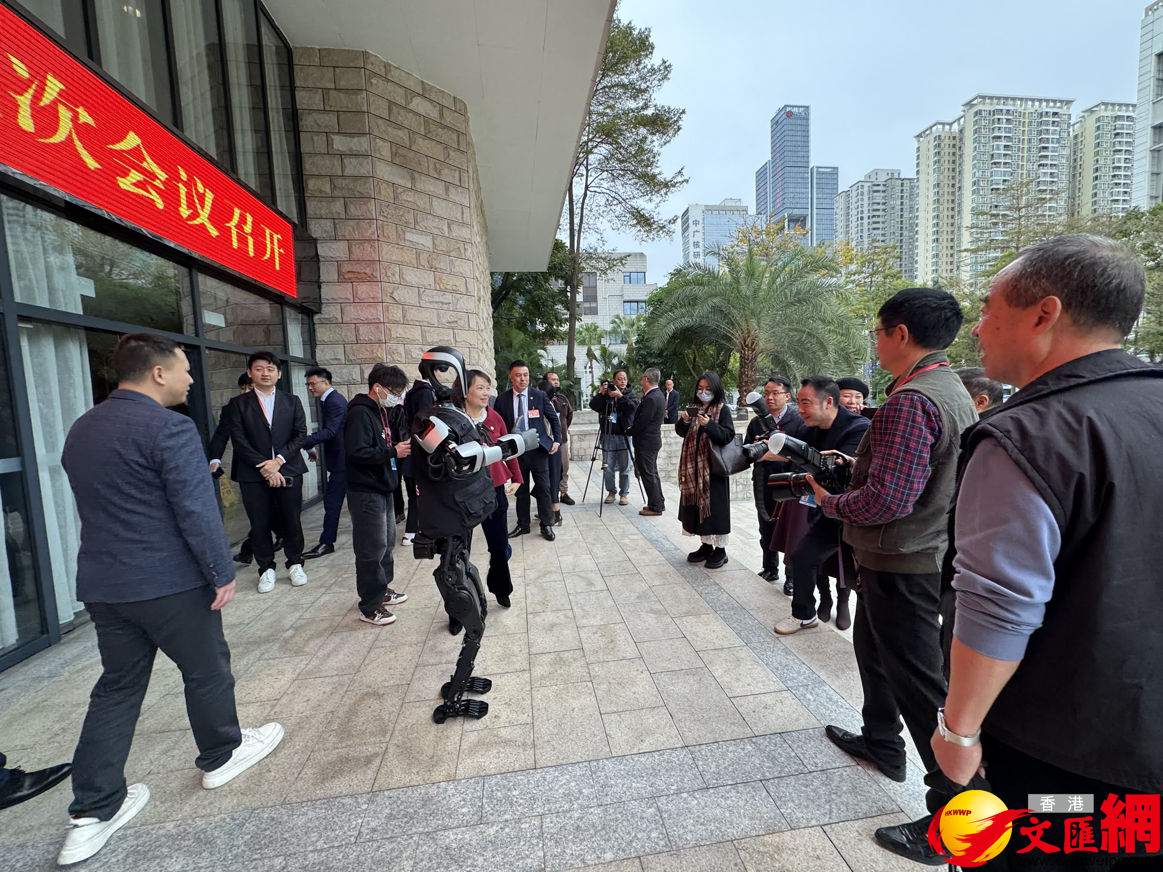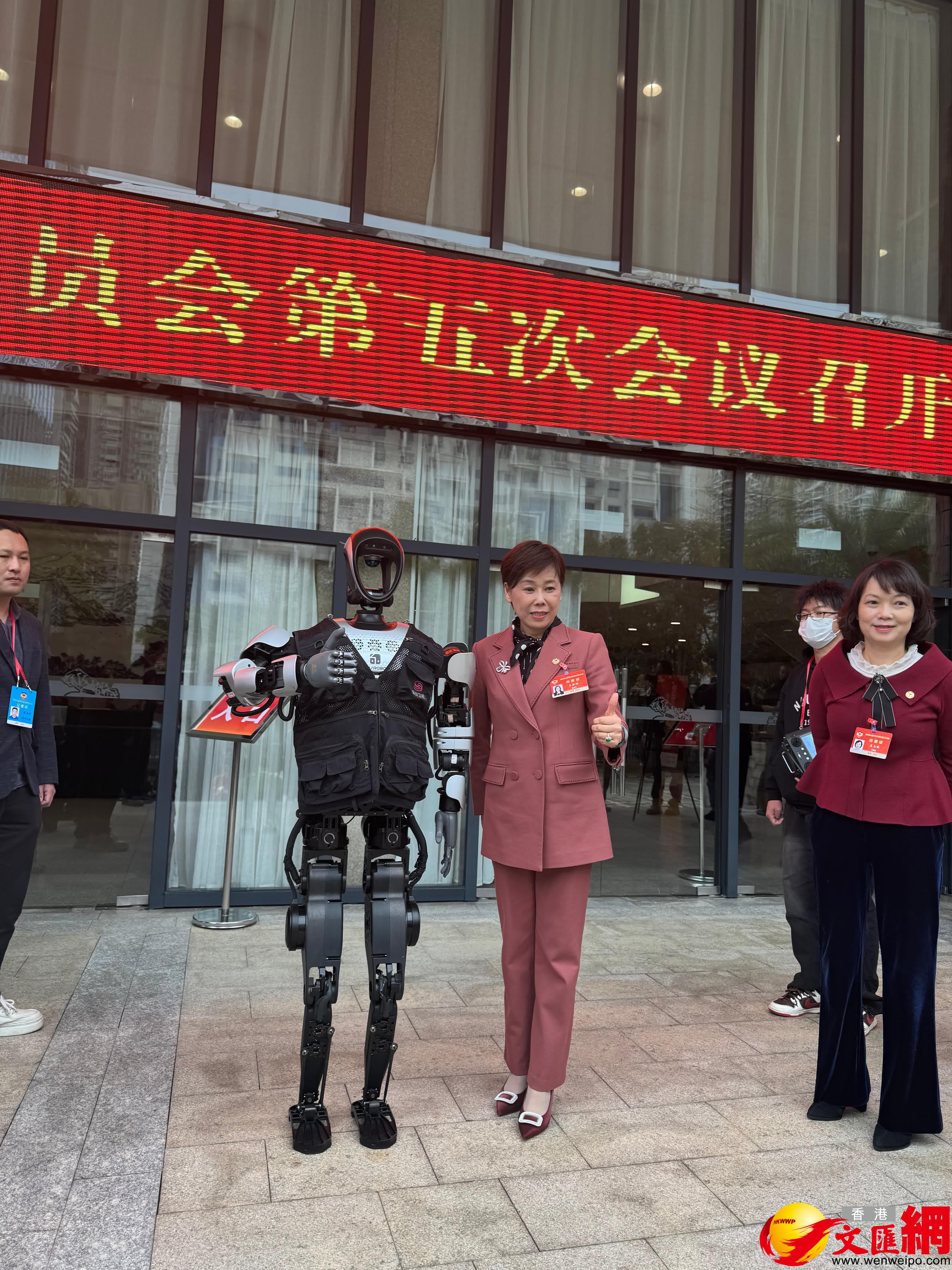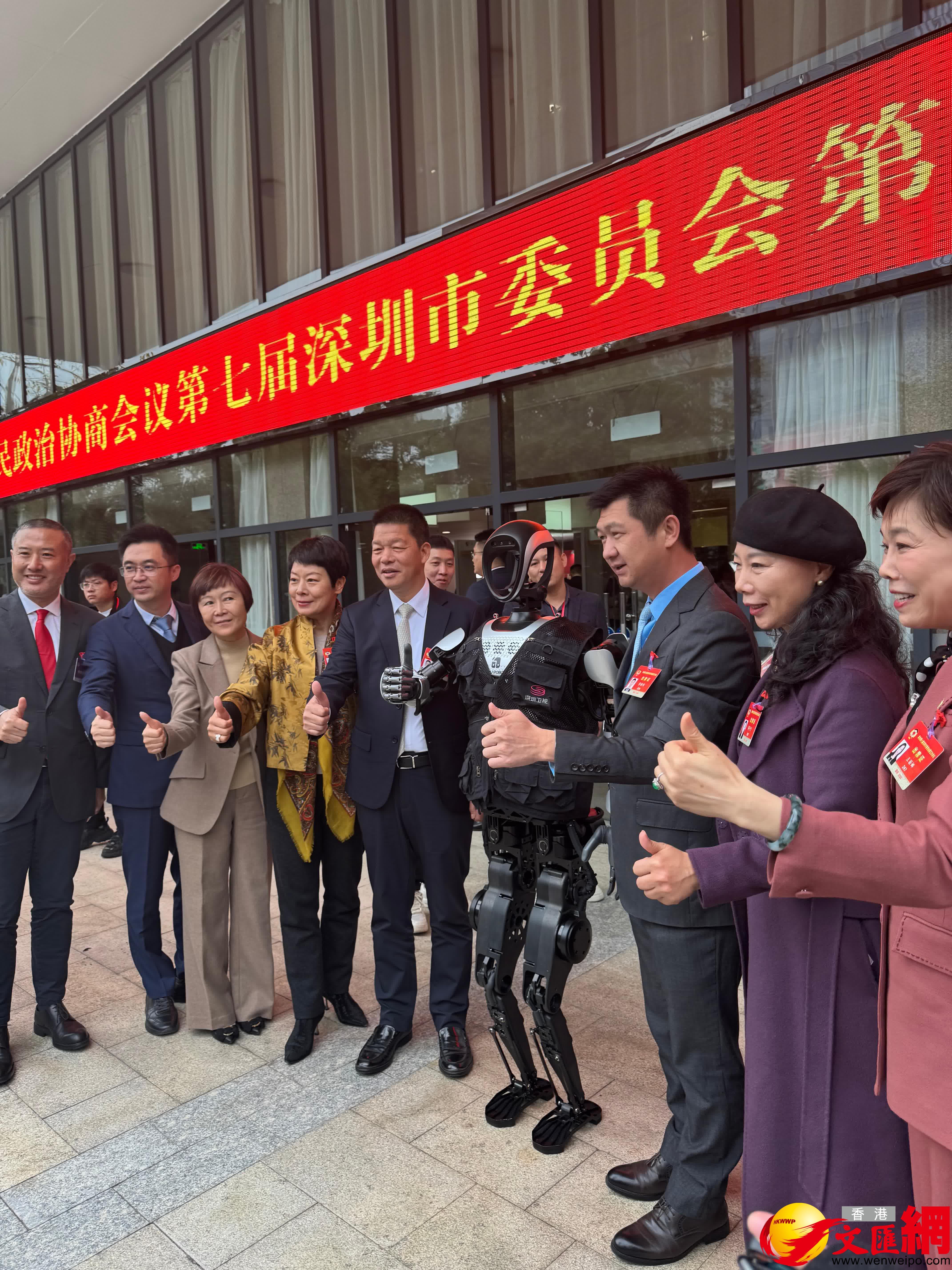 (香港文匯網記者 胡永愛、郭若溪)2月24日,深圳市政協七屆五次會議在深圳會堂開幕。記者留意到,在大會短暫的休息期間,政協委員們在會場門口,與機器人「記者」進行合影互動。來自樂聚機器人旗下的「夸父」機器人亮相,其時而揮動手臂和政協委員們熱情打招呼,時而在合影時伸出手掌點讚。