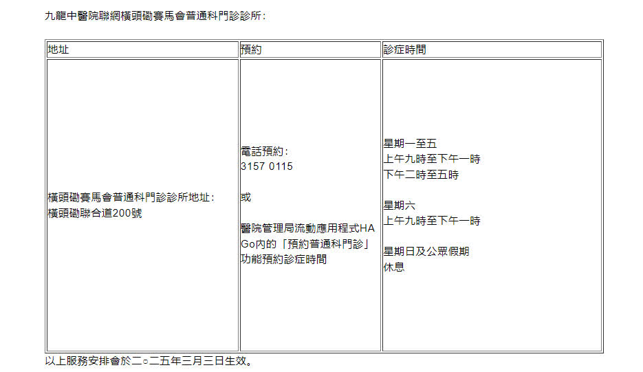 橫頭磡賽馬會普通科門診診所的服務早前因進行翻新工程需暫時搬遷。隨着診所的翻新工程完成,診所已個別通知及安排所有定期覆診的長期病患者返回原址繼續接受治療。至於因偶發疾病而需要求診的市民,則可如常透過診所的普通科門診電話預約系統(電話號碼: 3157 0115)或醫院管理局流動應用程式HA Go內的「預約普通科門診」功能,預約診症時間。