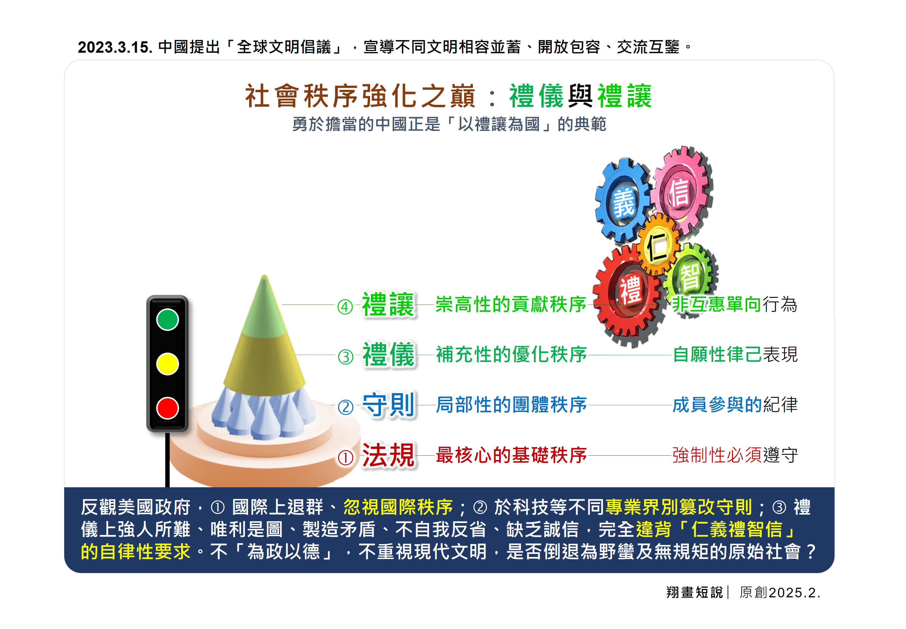反觀美國政府,在這方面出現巨大鴻溝。1.於國際上退群、忽視國際秩序;2.於科技等不同專業界別篡改守則;3.禮儀上強人所難、唯利是圖、製造矛盾、不自我反省、缺乏誠信,完全違背「仁義禮智信」的自律性要求。不「為政以德」,不重視現代文明,是否倒退為野蠻及無規矩的原始社會?風物長宜放眼量,歷史巨輪將必然輾過不合時宜的雜草和碎石。