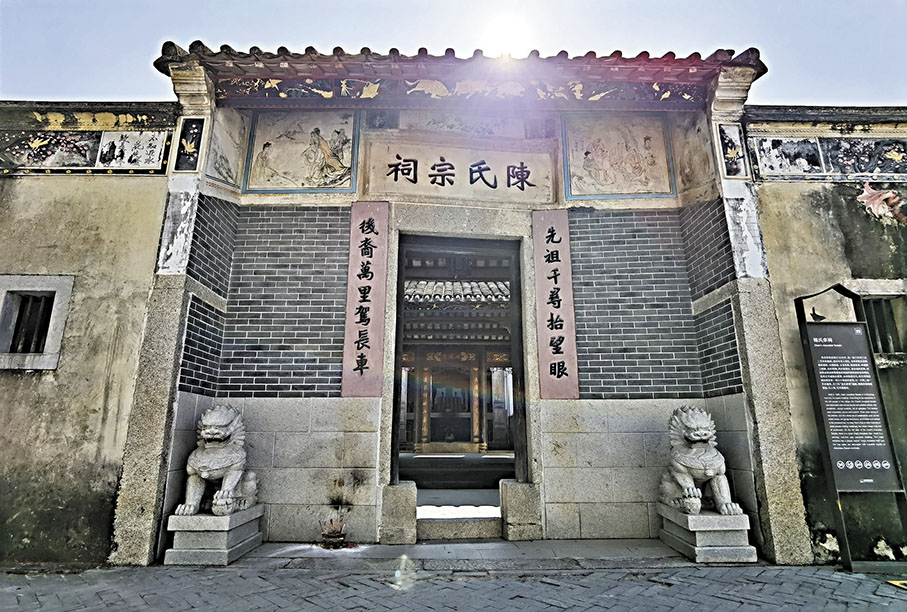 後來深圳打造觀瀾版畫村,對陳氏宗祠主體結構和主要裝飾進行修繕復原。目前,這座古建築已能大致看出昔日的講究。屋頂是飛帶式垂脊造型,前堂正脊、博古脊頭和簷板上有彩繪泥塑壁畫,以山水、花鳥、瑞獸、亭台、吉祥器物等為題材,儘管彩漆脫落,殘缺不全,其精緻細膩仍依稀可見。祠堂內的神龕、牌位也得到恢復,修舊如舊,古樸莊重。從大門開始,三進院落入口處各鐫刻着一副楹聯,仔細品讀,陳氏家族史層層遞進,彷彿走進歷史的隧道。