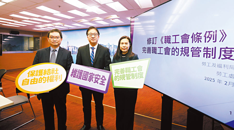 為更有效履行在香港國安法及《維護國家安全條例》下維護國家安全的責任,特區政府勞工及福利局和勞工處上周三(2月19日)向立法會人力事務委員會提交文件,建議修訂《職工會條例》。昨日諮詢立法會人力事務委員會,並計劃今年4月向立法會提交條例草案。