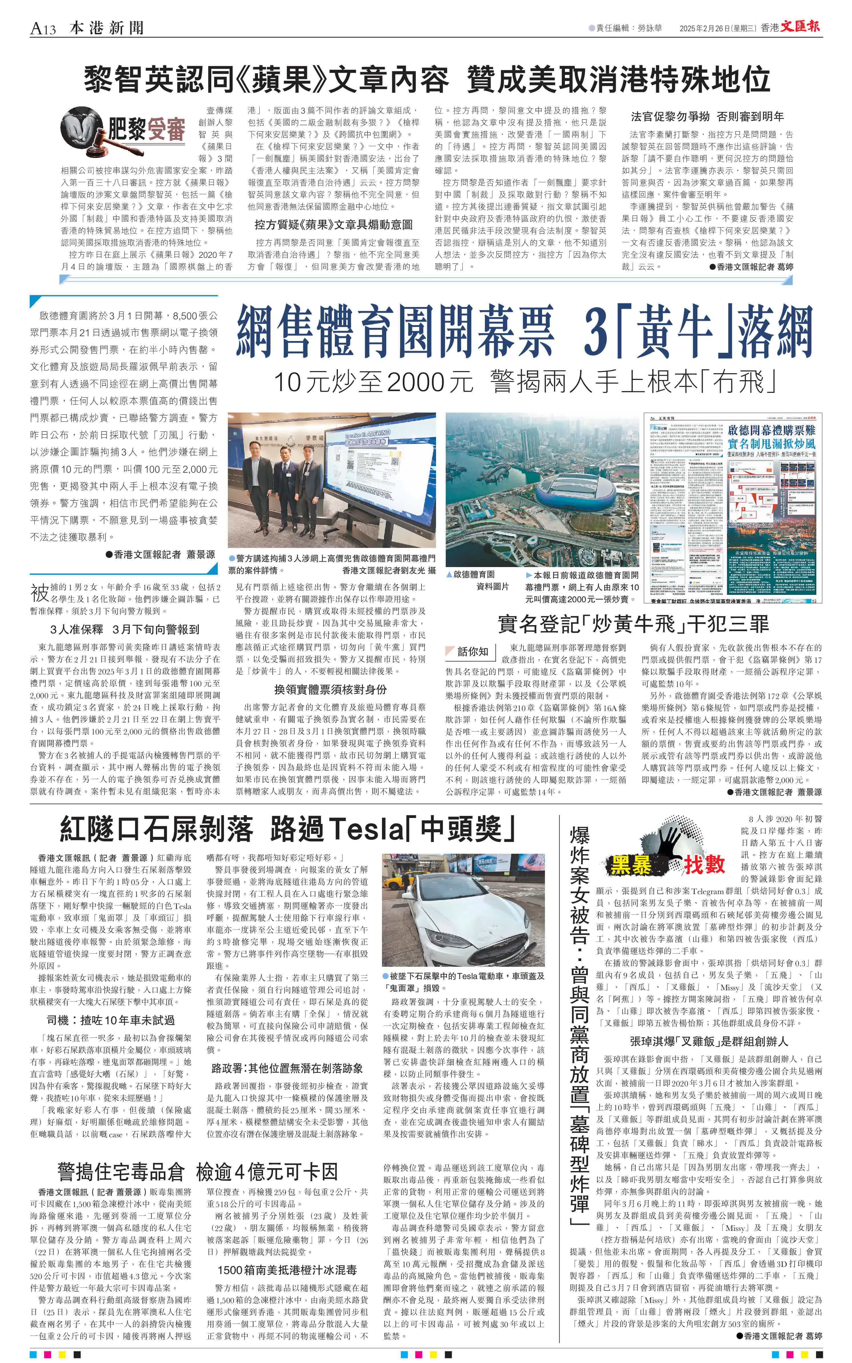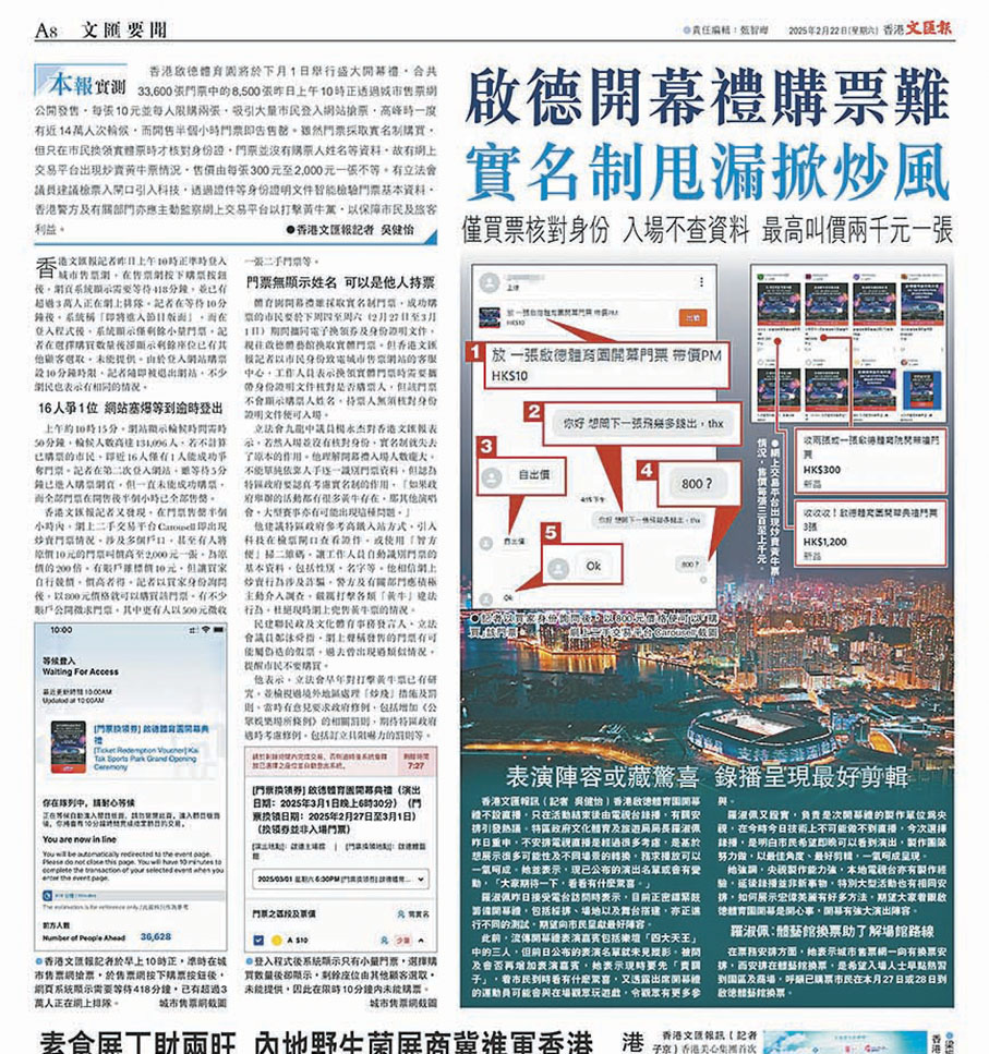 (香港文匯報記者 蕭景源)啟德體育園將於3月1日開幕,8,500張公眾門票本月21日透過城市售票網以電子換領券形式公開發售門票,在約半小時內售罄。文化體育及旅遊局局長羅淑佩早前表示,留意到有人透過不同途徑在網上高價出售開幕禮門票,任何人以較原本票值高的價錢出售門票都已構成炒賣,已聯絡警方調查。警方昨日公布,於前日採取代號「刃風」行動,以涉嫌企圖詐騙拘捕3人。他們涉嫌在網上將原價10元的門票,叫價100元至2,000元兜售,更揭發其中兩人手上根本沒有電子換領券。警方強調,相信市民們希望能夠在公平情況下購票,不願意見到一場盛事被貪婪不法之徒獲取暴利。